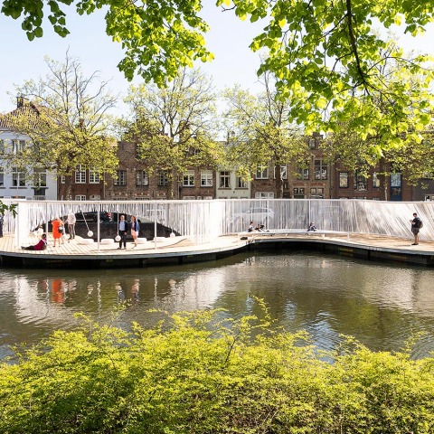 The Floating Island (la isla flotante) está situada en los canales, cerca del puente Snaggaardbrug. Con esta construcción, el estudio de arquitectura coreano OBBA ha buscado crear un espacio público complementario y activo con el centro de Brujas. Junto con el taller de arquitectura local, Dertien12, OBBA ha diseñado una plataforma flotante que ocupa más de 100 metros cuadrados. El pabellón está rodeado por pequeñas islas y es accesible al público, generando una nueva visión del canal con los ciudadanos.