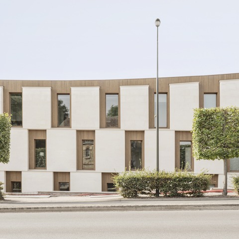 Todas las fachadas fueron tratadas con igual cuidado y elegancia. Presentan un ritmo regular en damero, alternando huecos de ventanas con marcos de piedra y madera. Esta lógica de modularidad y piedra apilada da como resultado una arquitectura simple, eficaz y compacta.
