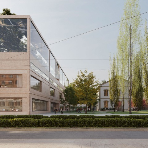 Caracterizado por una comparación directa entre arquitectura, naturaleza y paisaje, el proyecto propone un edificio con un volumen simple y una paleta de materiales reducidos, en diálogo con el edificio de oficinas cercano y con Piazza Alighiero Boetti. Las fachadas están definidas por elementos horizontales y verticales de hormigón pulido y grandes vanos. La estructura del edificio se eleva para concluir en el nivel del techo, donde un compluvium espejado define el espacio del jardín colgante.