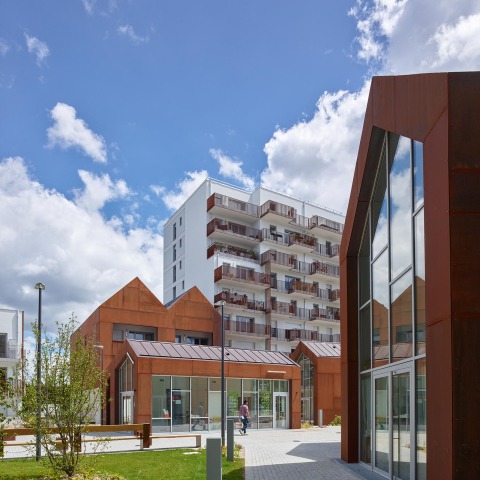 Los arquitectos utilizan un material recurrente, el acero oxidado, que se utiliza en paneles de revestimiento, en las barandillas de bloques residenciales y para amueblar espacios comunes.