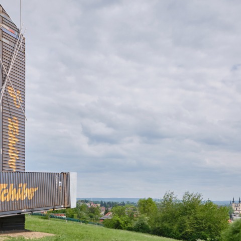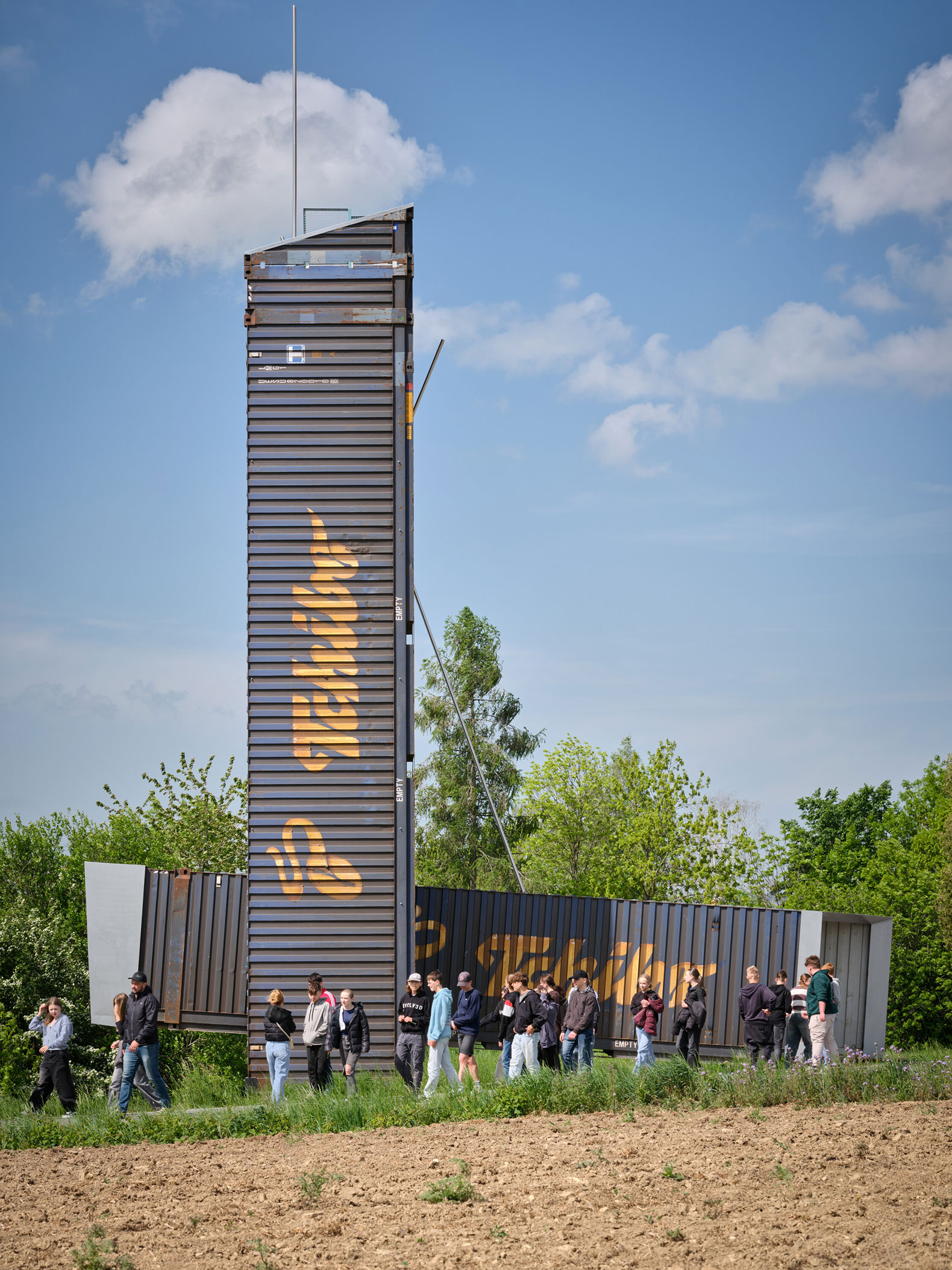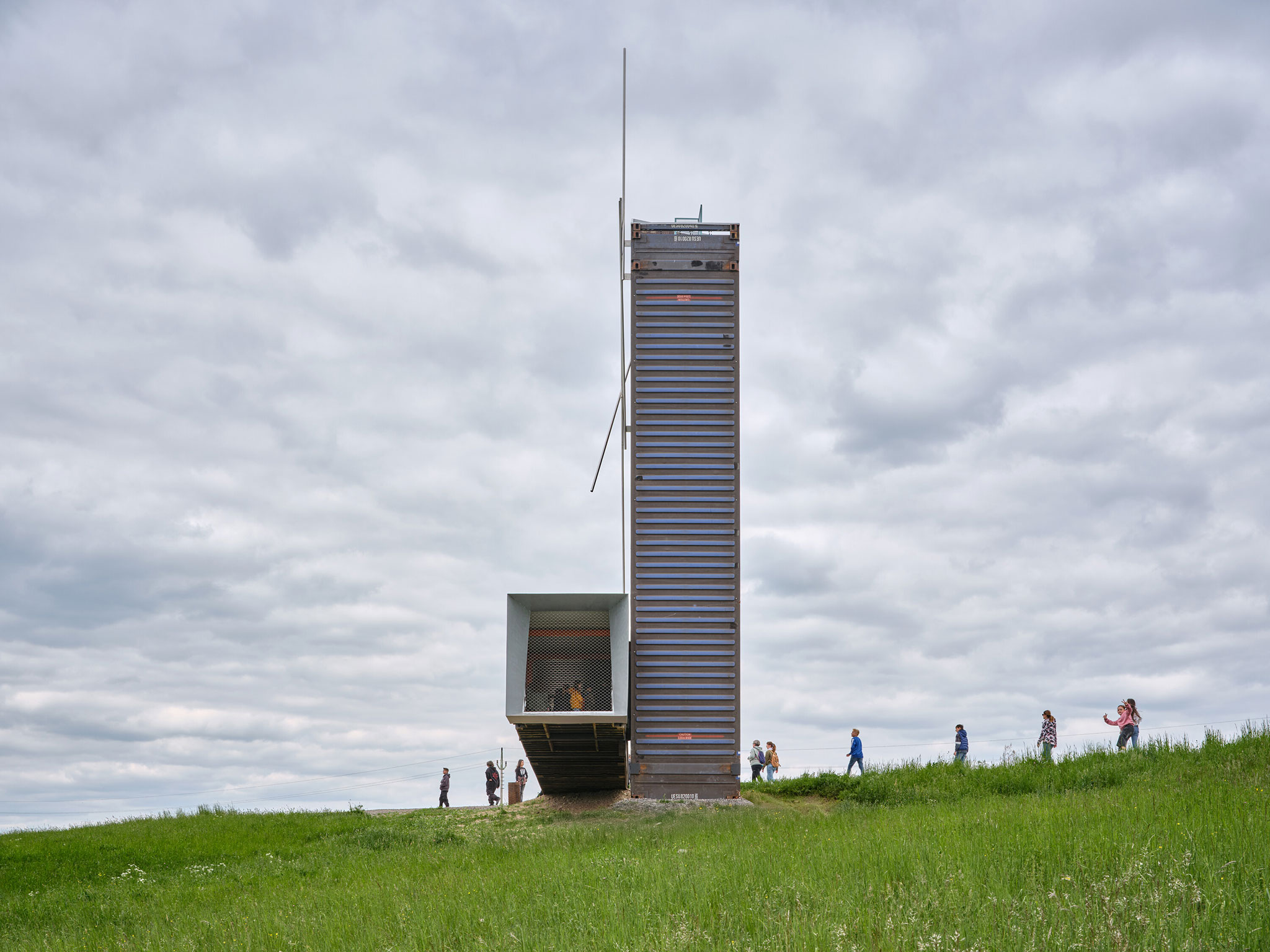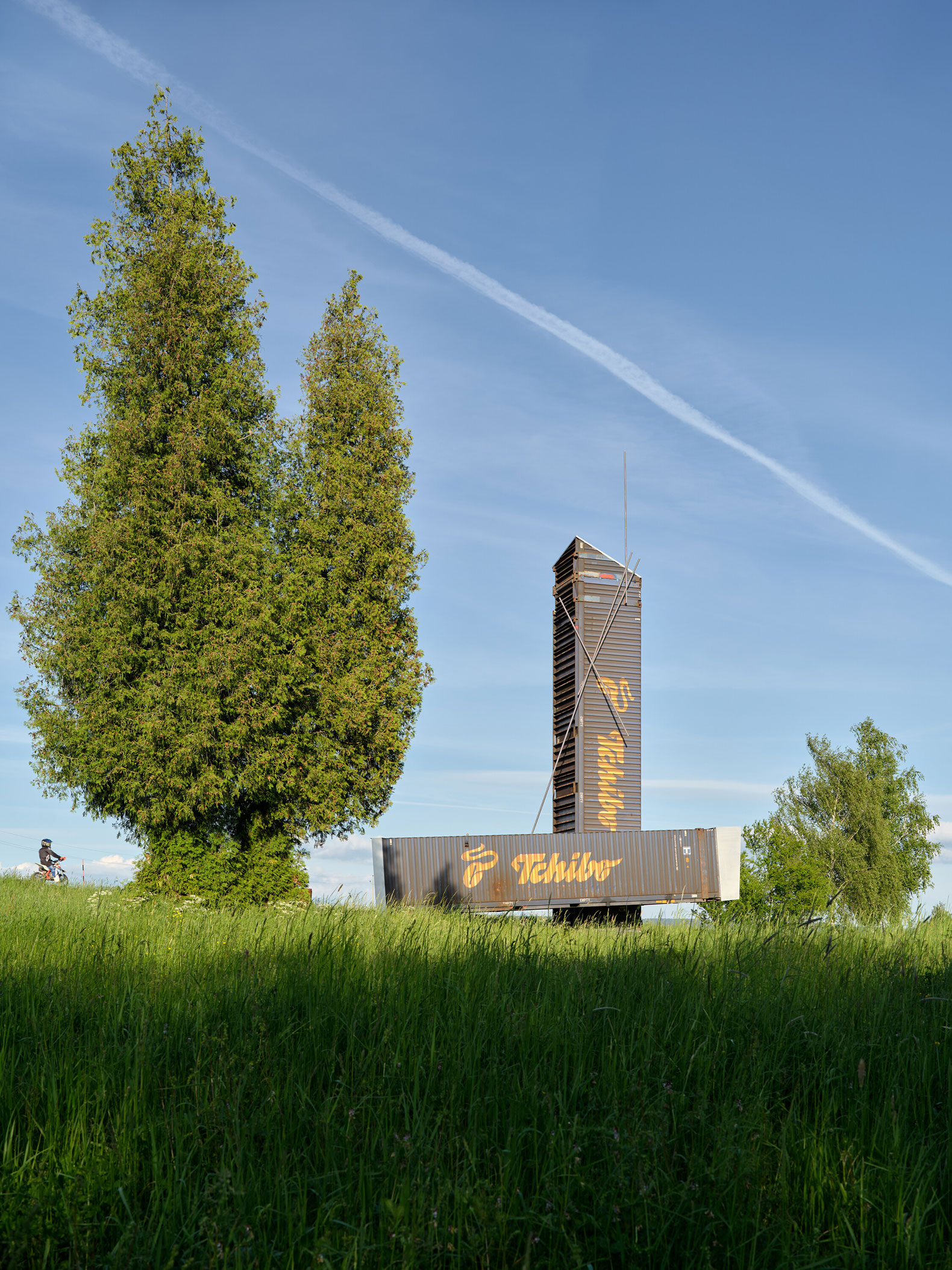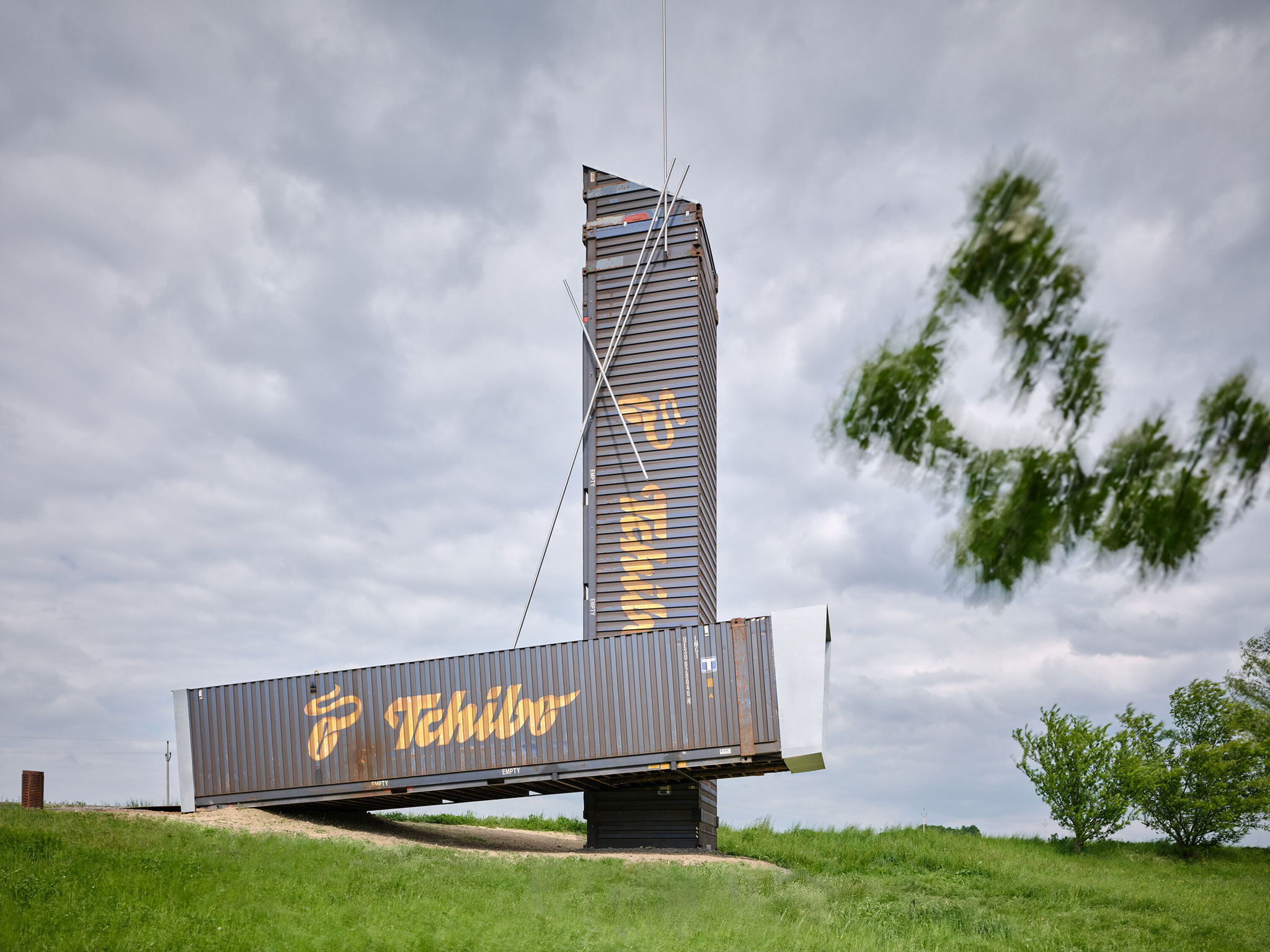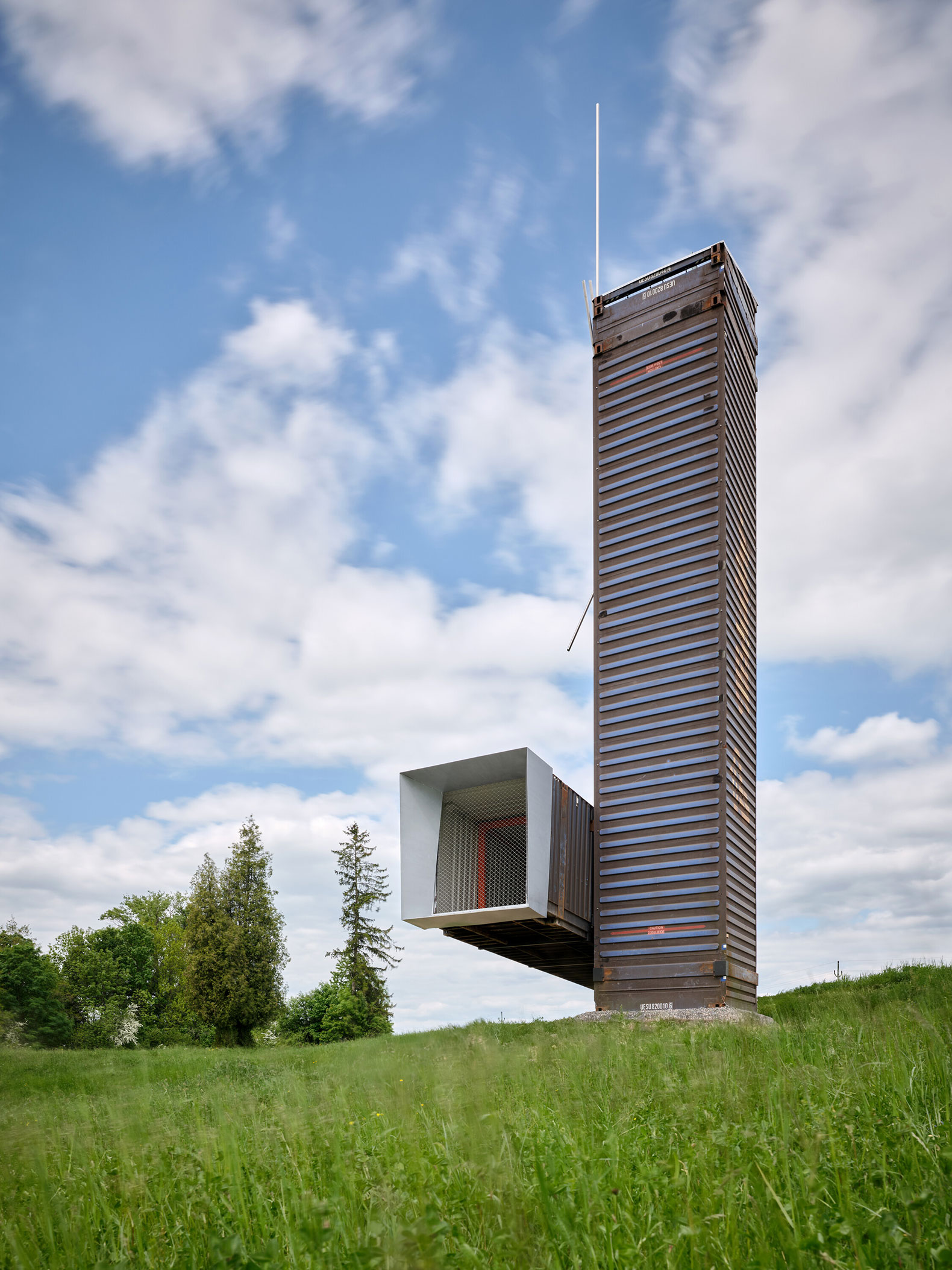 La escalera consta de largueros perimetrales de acero de chapa metálica, entre los cuales se insertaron escalones y rellanos de rejilla. Remata con una plataforma de observación de varios niveles. Las diferentes alturas y niveles de las plataformas permiten vistas en todas las direcciones y ofrecen asientos. Los contenedores de envío están hechos de acero COR-TEN, resistente a la corrosión. Para preservar su autenticidad, se conservaron con su acabado original. No se limpiaron ni pintaron específicamente. Solo se aplicaron recubrimientos a las nuevas estructuras de refuerzo.