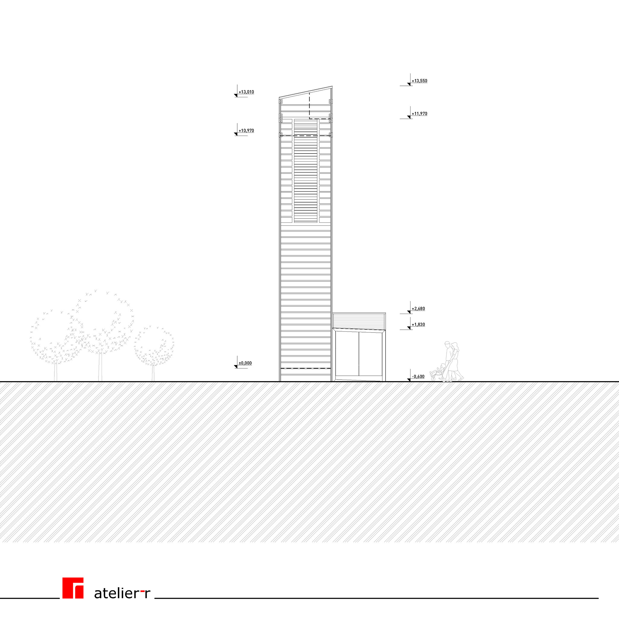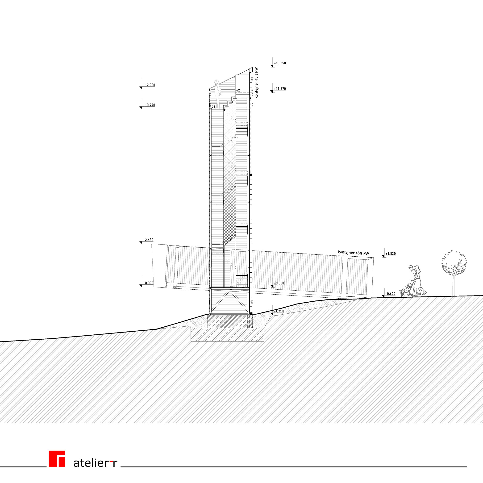 El estudio Atelier-r ha utilizado una estructura de hormigón armado para la cimentación y una losa escalonada debajo del contenedor vertical. Los contenedores reutilizados tienen unas dimensiones normalizadas: 13.715 mm de largo, 2.550 mm de ancho y 2.633 mm de alto. Una estructura de acero de refuerzo, compuesta por perfiles cerrados de este material, los interconecta, garantizando la estabilidad y conteniendo la escalera de acero insertada.