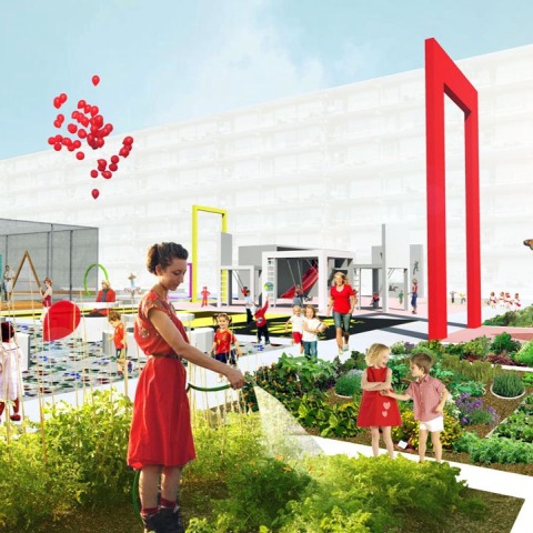 Nos tomamos el deseo de los organizadores del concurso, la Fundación Richard Krajicek (RKF) - de integrar, tanto como fuese posible, los edificios circundantes en el diseño de la nueva zona de juego - literalmente y recogimos un apartamento típico de uno de los edificios del barrio, aumentando cinco veces, y lo utilizamos como la planta para el patio de recreo propuesto. El proyecto se basa en la convicción de que la reproducción de un apartamento del barrio haría más fácil a los habitantes de la zona que se identificasen con el nuevo patio de juegos. Todo lo que eventualmente llevaría a un lugar socialmente sostenible y un fuerte sentido de pertenencia entre las personas.