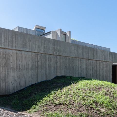 En función de la amplitud del sitio, surgió la idea de extender en planta baja planos en varias direcciones a los fines de arraigarse al mismo, luego en planta alta tomando al programa como armador de la idea se propuso un prisma rectangular que se apoya sobre ellos. Entre medio de esta pulseada entre programa y sitio aparece la luz natural utilizada como ¨materia¨ que por momentos toma la misma fuerza que el hormigón.