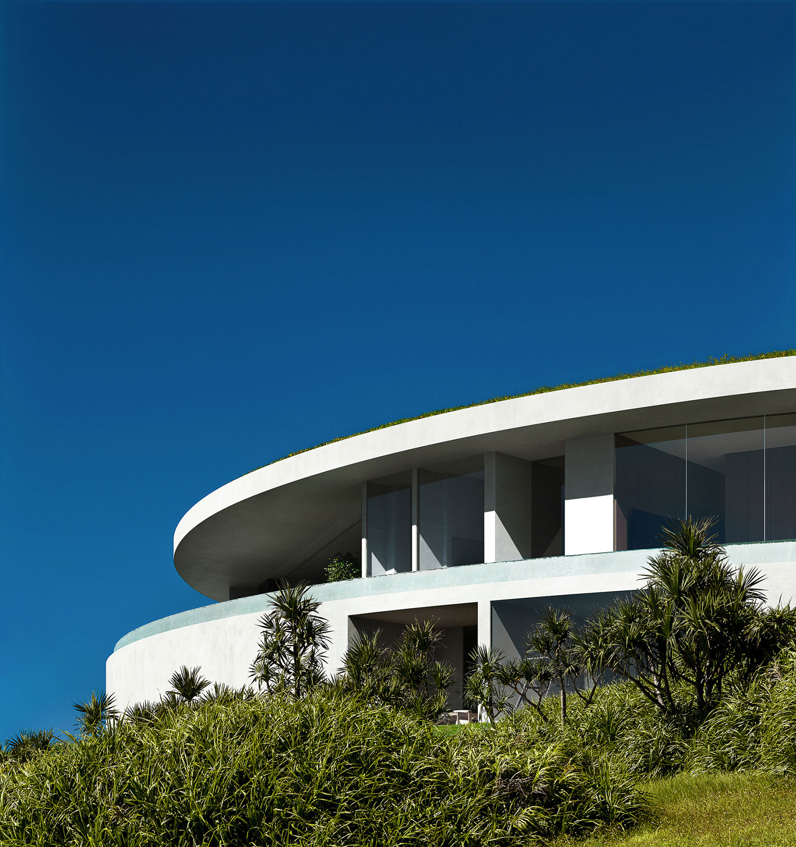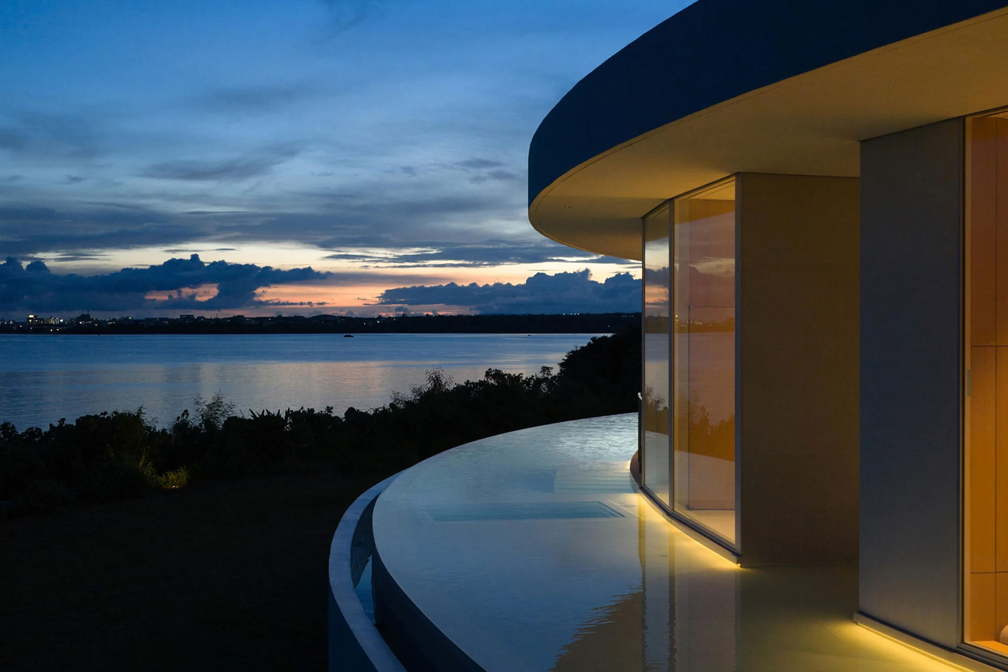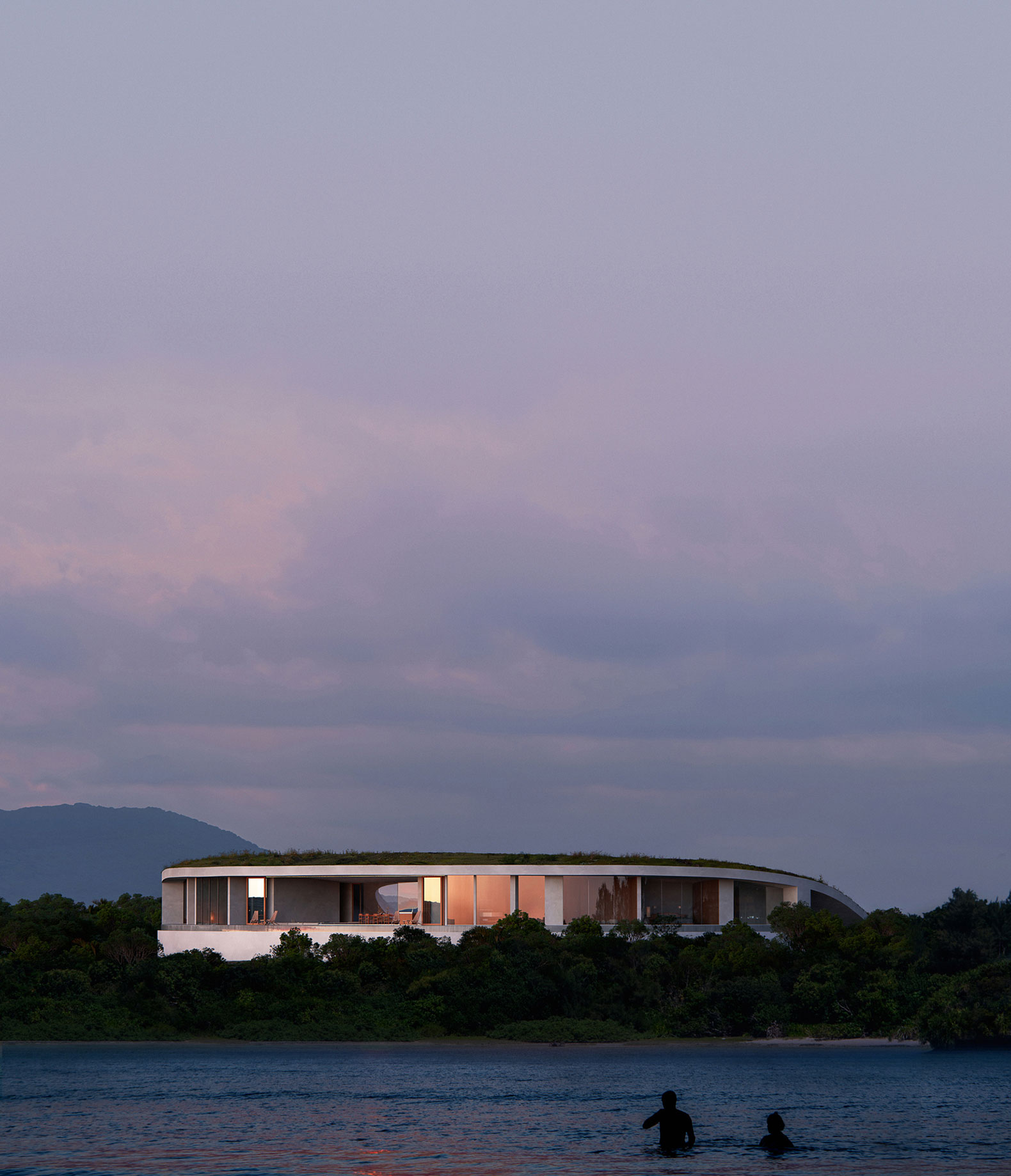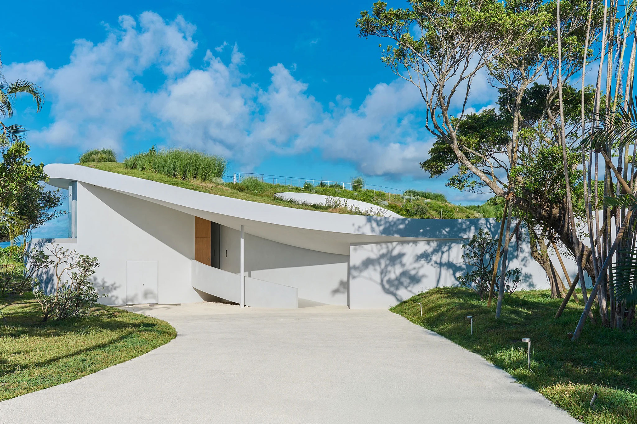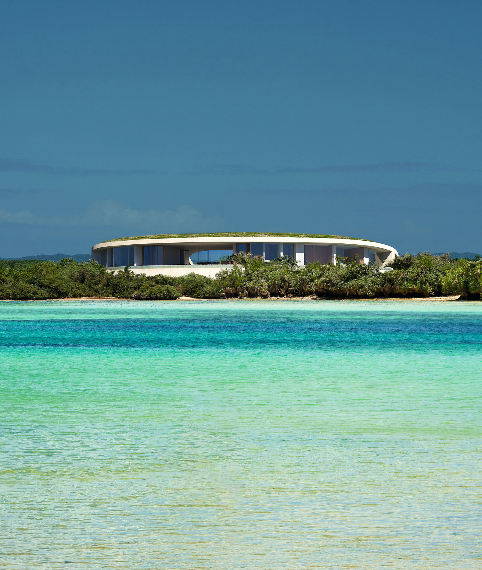 El edificio se integra con la vegetación desde arriba, y desde el océano, su altura es prácticamente la misma que la de los árboles circundantes, creando un exterior que se integra con la naturaleza de la isla de Ishigaki.