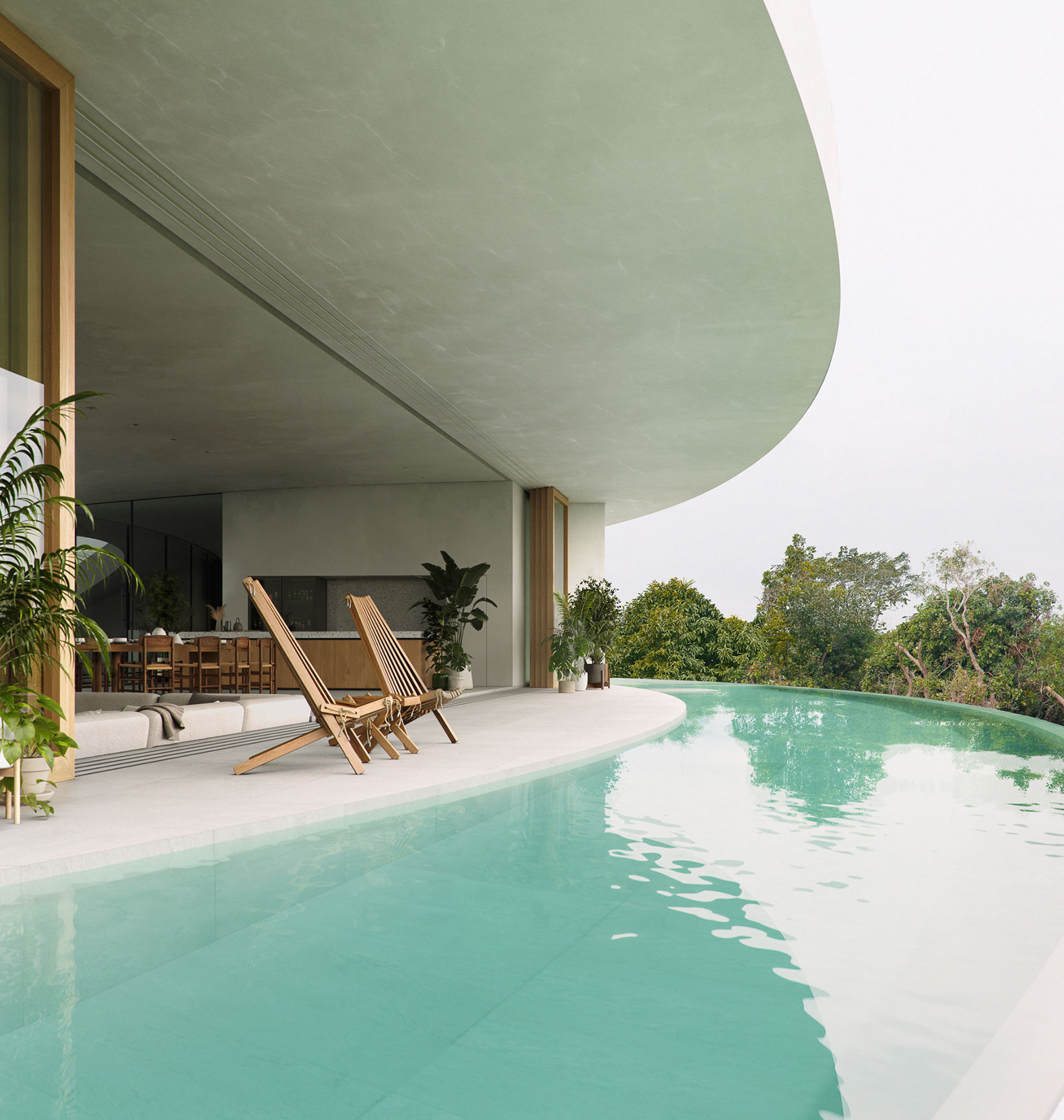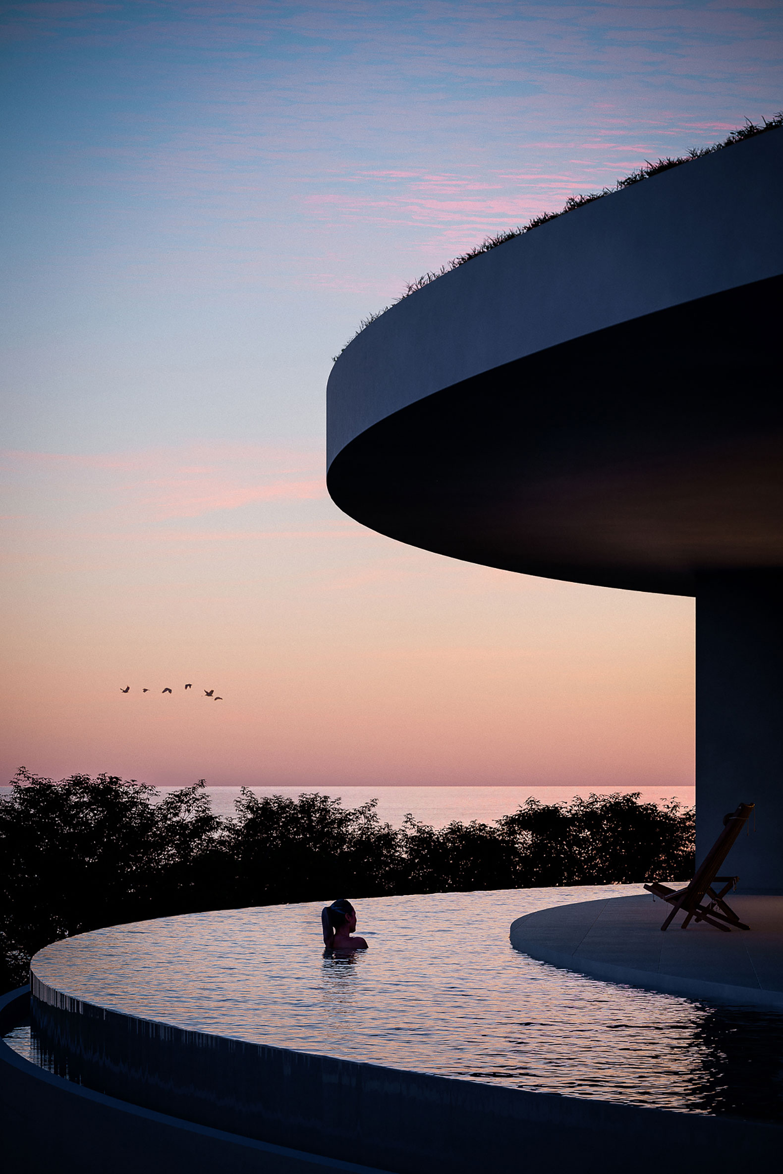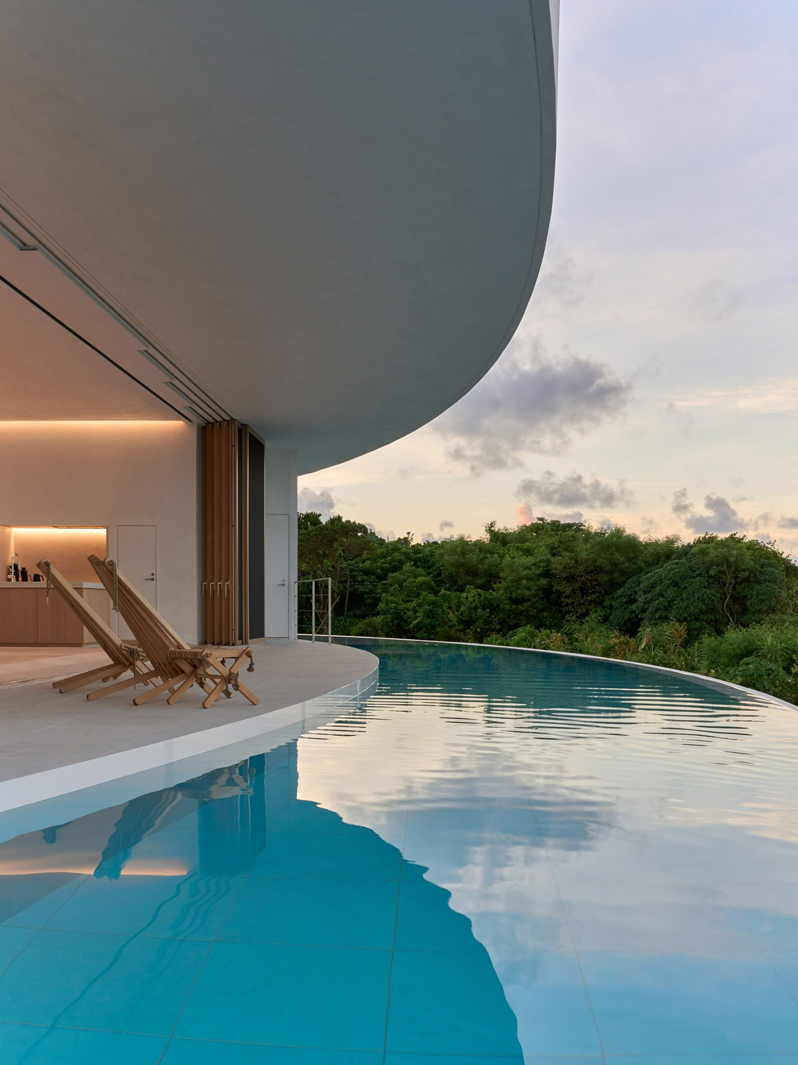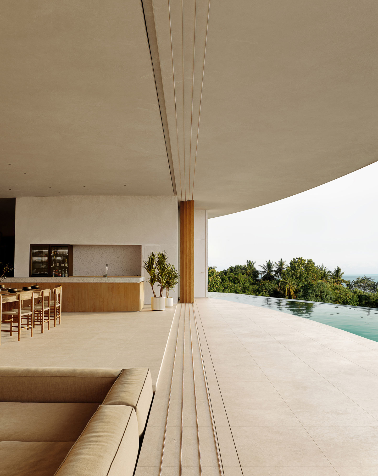 El espacio está proyectado para favorecer una experiencia de recogimiento y bienestar, mediante la disposición estratégica de ámbitos colectivos y privados, incluso cuando se encuentra ocupado en su totalidad por hasta diez personas. Las zonas comunes, como el salón-comedor y la piscina con vistas al mar, están concebidas para propiciar la interacción social, en contraste con el patio interior, orientado a la vegetación, que ofrece un ambiente más introspectivo.