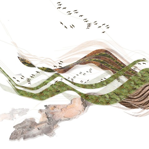 En una visita al sitio, observamos a los pájaros dirigidos por la inteligencia grupal, recogiendo un rebaño y sobrevolando la meseta del lugar. Proyectamos las líneas de los movimientos de las aves en el sitio agrícola del Wagnersberg y las redibujamos en nuestra propuesta.