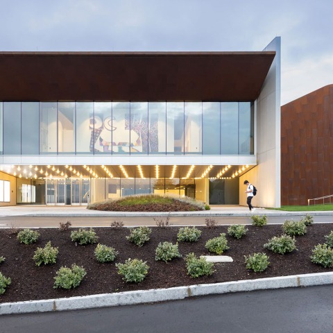 La identidad dual del edificio también se expresa en sus materiales, que son resistentes e industriales sin sacrificar la calidez y el confort. Estamos emocionados de que el centro de artes escénicas dé la bienvenida a los estudiantes y profesores a un nuevo tipo de espacio para Holy Cross, uno que pone la interseccionalidad, la inclusión y la interdisciplinariedad en el centro”.