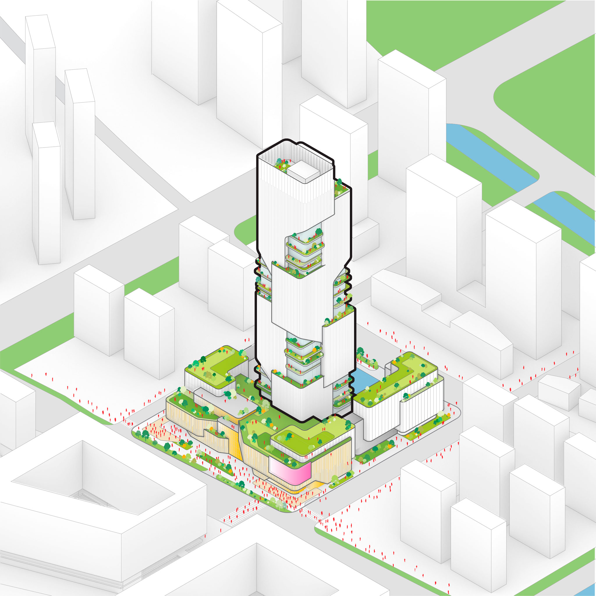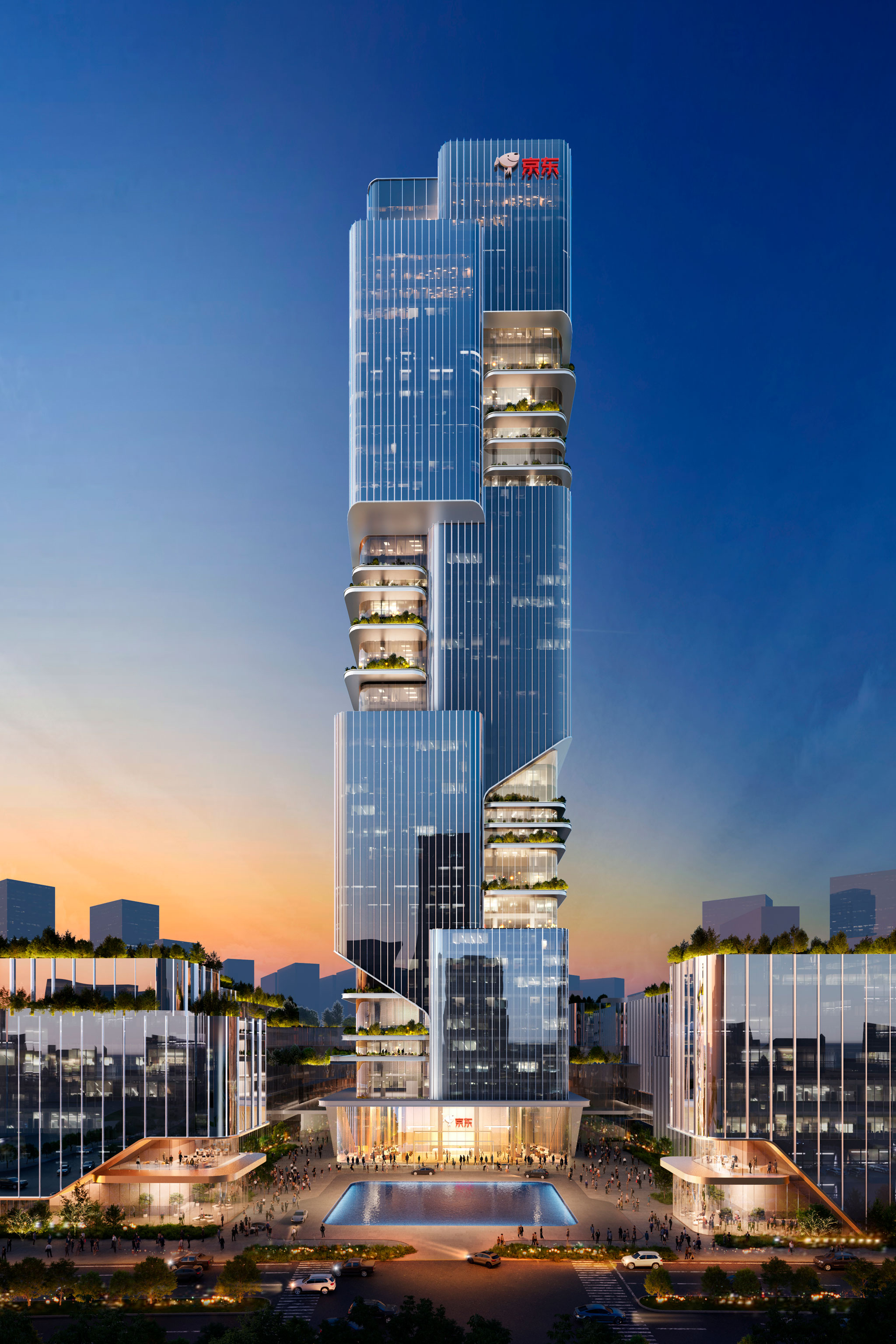 El anillo de volúmenes de baja altura abraza la base de la torre central, conectando y dinamizando las calles circundantes, a la vez que extiende la presencia de JD.com a la ciudad en general. La plaza de entrada está pensada para ser funcional, permitiendo un fácil acceso peatonal y vehicular, y ceremonial, definida por fuentes y una explanada ajardinada.
