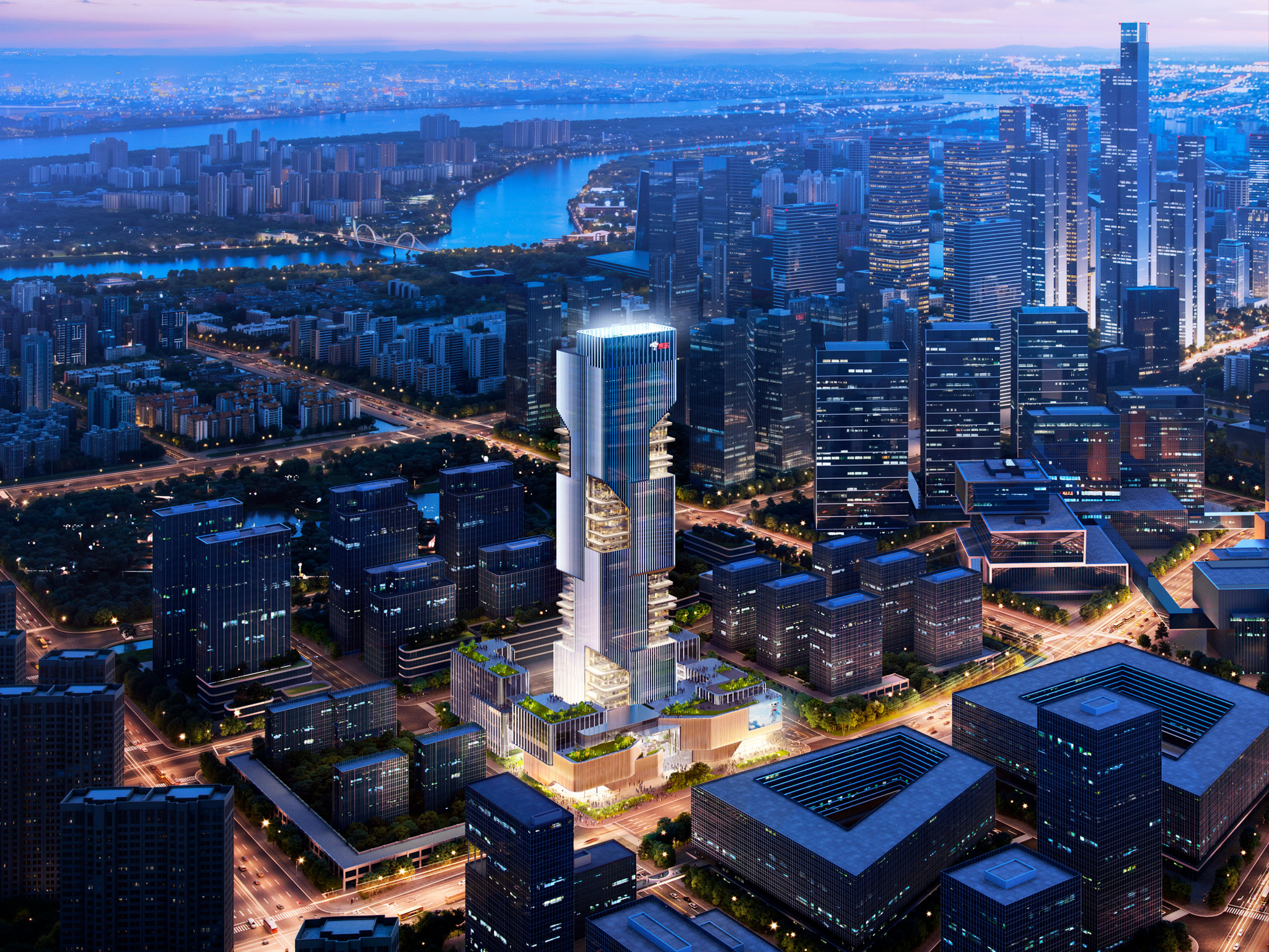 La propuesta de Ole Scheeren para JD Beacon traduce la ambición tecnológica de JD.com en una forma arquitectónica, compuesta por una torre central y un anillo de edificios de baja altura que forman un conjunto coherente alrededor de una plaza central. La torre se compone de volúmenes entrelazados y terrazas abiertas empotradas, creando un vínculo tridimensional continuo que interactúa con la ciudad en todas las direcciones. Estos espacios actúan como ventanas que revelan entornos de oficina diseñados para un trabajo eficiente y productivo, símbolo de la innovación del distrito y el progreso de la ciudad. Las amplias terrazas abiertas amplían los espacios de trabajo y reunión al exterior y ofrecen vistas de Nanjing. Esta configuración proporciona un entorno productivo para la investigación, a la vez que consolida una presencia distintiva en el panorama de innovación del distrito de Hexi.