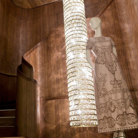 Materiales de lujo como el Terrazo gris a la Veneciana gris con piedra de Carrara, madera, mármol, vidrio, cuero y alfombras de felpa han sido utilizados. La arquitectura de la tienda se ha integrado con las piezas expuestas, centrando la atención en las colecciones. El acabado de las paredes varía de una habitación a otra: fríos espejos alternan con paneles hechos a medida o tubos de vidrio de borosilicato para dar un efecto de drapeado glaseado para las zonas dedicadas al prêt-à-porter. Las lámparas se han creado a partir de ocho lentes ópticas montadas en lunetos de bronce de diferentes formas. El mobiliario en todas las habitaciones se ha diseñado específicamente dar la sensación de estar ante una colección personal mezclando piezas modernas, cómodas y contenedores hechos a medida con elementos inspirados en la decoración Art Decó.