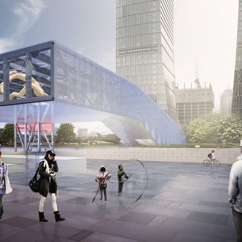 OMA concibió el centro de exposiciones como "armadura espacial," suspendida sobre una plaza y conectada a otro espacio de exposición por debajo de la rampa. El edificio se organiza como un espacio abierto, añadiendo nuevas oportunidades programáticas para la proyección de películas, desfiles de moda y conciertos. El nuevo volumen transforma la rampa existente en un espacio teatral a gran escala para eventos, mientras que la plaza cubierta debajo de la caja elevada puede ser utilizado para eventos más íntimos.