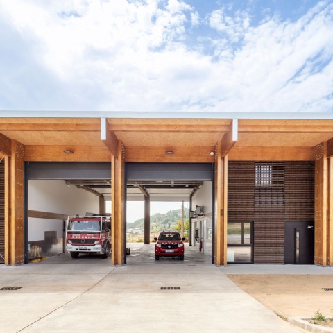 Los arquitectos Josep Ferrando, Manel Casellas, Mar Puig y Pedro García adoptan una doble escala de un pórtico embebido en otro pórtico y resuelven la dualidad entre la domesticidad que requiere el bombero y la gran dimensión de los camiones que habitan la cochera.