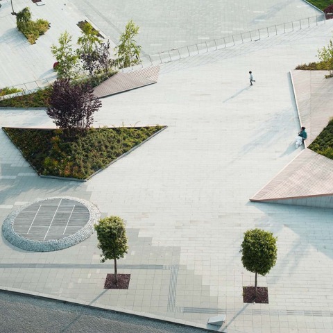 Parque público con plataformas para contemplar el atardecer, una rampa curva, una sala de teatro exterior y un parking subterráneo con 1.000 plazas de aparcamiento.