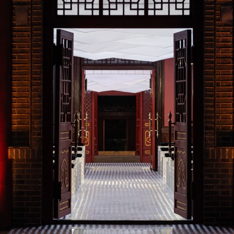 El diseño de AMO crea una continuidad visual en todos los lugares mediante la inserción de una capa de elementos de iluminación que reinterpretan el patrón de las linternas de papel chinas. Los techos brillantes y las particiones verticales hechas de módulos triangulares tridimensionales, proyectando los espacios con una luz rosa suave, crean un ambiente cálido amplificado por el reflejo en los estanques. En contraste con los elementos de iluminación cuidadosamente elaborados, el piso y las áreas de asientos están cubiertos con láminas de metal para los estribos, que actúan como otra superficie de espejo, amplificando aún más la atmósfera.