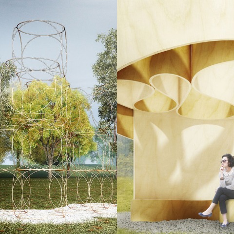 Con la configuración de templo Queen Caroline en mente, hemos diseñado una completamente nueva casa de verano. La construcción se levanta independiente con todos sus lados visibles, y concebida como una serie de bandas estructurales ondulantes, como una reminiscencia de un dibujo del contorno ciego. Las bandas horizontales recuerdan el recorrido en capas del templo Queen Caroline, a pesar de su naturaleza idiosincrásica. La nueva casa de verano se organiza como cuatro bandas estructurales, comenzando con un nivel del banco anexo al suelo, sobre el cual se levanta una segunda banda de tres paredes en forma de C, coronadas por un tercer y cuarto nivel que forman una cubierta en voladizo. La casa de verano se construye a partir de tableros y madera, materiales intrínsecamente en armonía con la geometría de bucle de la estructura.