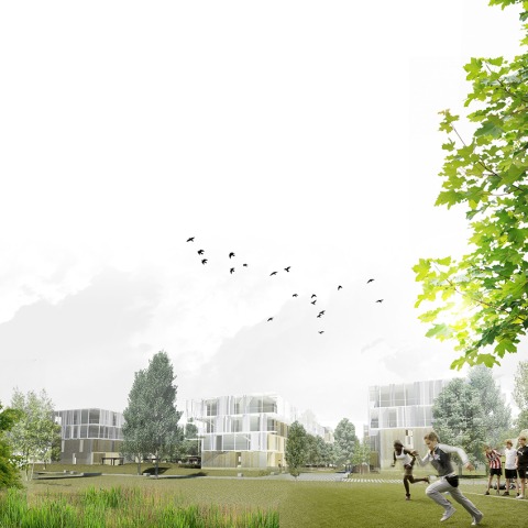 El proyecto que planteamos tiene dos caras bien diferenciadas, la primera da al exterior de la parcela, se pone en contacto con la ciudad y se abre a ella de manera estable y contundente. La segunda se centra en el contacto con el interior, con el parque y los jardines, es más débil en su aspecto, más amable y lee la vegetación y trabaja con ella. Por tanto, frente a la uniformidad aparente de la edificación aparece un proyecto sensible con el lugar y sus características, con las personas que deberán disfrutar de las viviendas y con un uso preciso y eficiente. Si bien los edificios que se sitúan en el límite de la parcela son de naturaleza más icónica, los del interior cambian su composición para responder a las vistas, las orientaciones y a la posición especifica en la localización. Son unos edificios de pocos materiales que se combinan para obtener un resultado diverso. Madera y acero, vidrio de manera limitada y una vegetación que constituye un elemento fundamental en el conjunto edificado.
