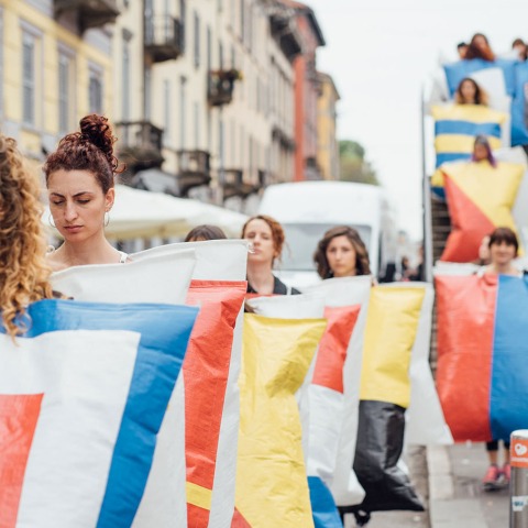 Los performers, unos 50, atravesaron un largo recorrido, de BASE pasando por los canales hasta llegar al cobertizo para botes, San Eustorgio y las columnas de San Lorenzo. En cada etapa, las banderas reconstruidas con cojines neumaticos por Raumlabor, proclamaban su mensaje de denuncia y esperanza, una advertencia para una