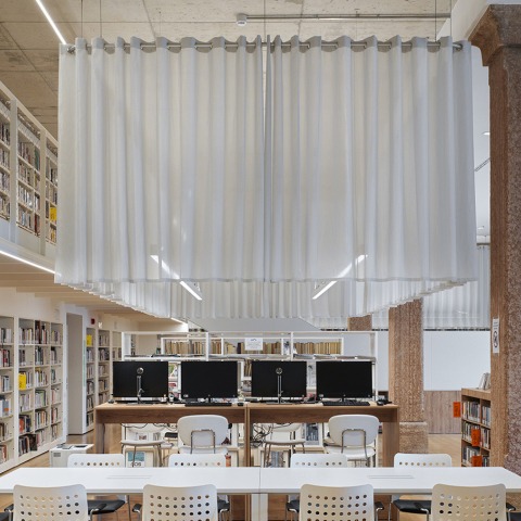 El espacio de la Biblioteca se caracteriza arquitectónicamente por la presencia de elementos suspendidos del techo que hemos definido como «volúmenes suspendidos». Se trata en realidad de elementos textiles que enmarcan y organizan perceptualmente el espacio, marcando desde arriba zonas específicas: la zona de entrada a la Biblioteca desde el Vestíbulo, la escalera recta que conduce a la entreplanta y una zona de consulta más recogida.
