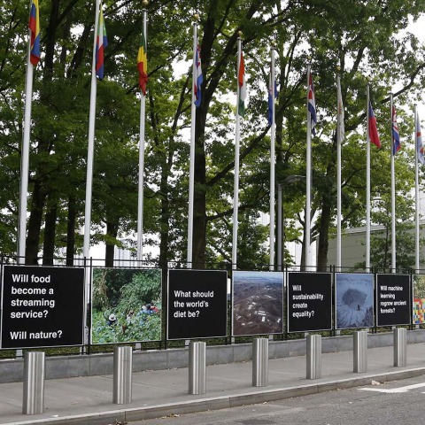 Anticipándose a la cumbre, AMO se hace cargo de las vallas de la sede de la ONU en Nueva York como un sitio para un discurso renovado sobre el campo. Una serie de paneles presentan preguntas e imágenes para ilustrar las transformaciones rurales de diferentes tipos, desde el permafrost siberiano hasta los invernaderos holandeses futuristas que alteran todos los conceptos existentes en la agricultura. Cada panel se centra en un aspecto de la innovación agrícola, el cambio ecológico y la producción y seguridad alimentaria. En la intersección de la cultura y la formulación de políticas, Countryside en las Naciones Unidas invita a la reflexión, la respuesta y la acción, abriendo el debate público.