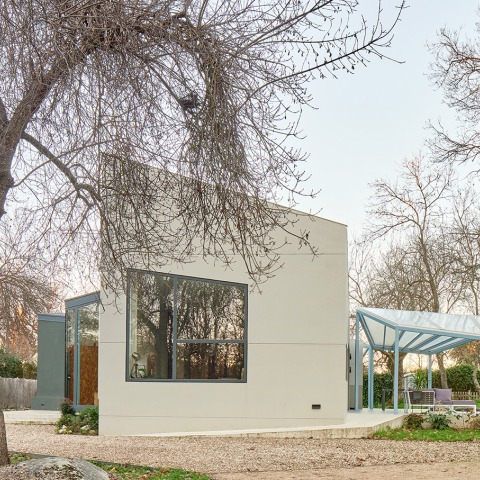 En el porche exterior, una pérgola de diferentes anchos y alturas, se extiende por la fachada sur de la vivienda, generando un espacio intermedio entre el exterior y el interior que también permite aprovechar la orientación sur. Para la estructura se emplean materiales traslucidos como el policarbonato que facilitan el paso de la luz, o cables de acero que soportan la vegetación trepadora.