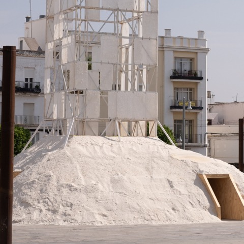 El pabellón temporal proyectado por José Rodríguez y Carlos Montes reflexiona sobre la regeneración del espacio urbano en un diálogo entre el entorno y sus recursos, mediante un volúmen que emula la forma de una de las montañas de sal habituales en el entorno cercano. El proyecto busca activar el potencial de los recursos naturales más abundantes y sostenibles con que cuenta la provincia de Cádiz, empleando la arquitectura como herramienta para transformar el espacio público.