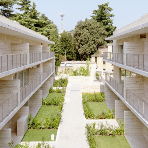 Sin duda, la principal preocupación ha sido respetar la continuidad de la trama urbana, diseñando los nuevos volúmenes teniendo en cuenta las alturas de las edificaciones circundantes y la conformación de las parcelas colindantes. A pesar de que se trata de una intervención privada, el programa funcional incluyó plazas de aparcamiento municipal, y una vía peatonal pública autónoma (permeabilidad de la parcela), abierta durante la mayor parte del día, conectando vía Roma con vía Postporta. Todo esto da como resultado que la ciudad ingrese y cruce el complejo. Tanto el peatón residente como el no residente experimentan la sensación de entrar en un pequeño pueblo marcado por algunos elementos que dotan al conjunto de una característica articulada: desde los portales que señalizan los accesos, hasta los volúmenes que se elevan desde los sótanos, iluminando los niveles subterráneos con luz natural. Desde el punto de vista del estudio de la tipología de vivienda, la elección de diseñar apartamentos con doble exposición (este-exterior) asegura una mejor eficiencia térmica (ventilación cruzada) y una orientación solar óptima. Grandes balcones funcionan como una extensión de las salas de estar.