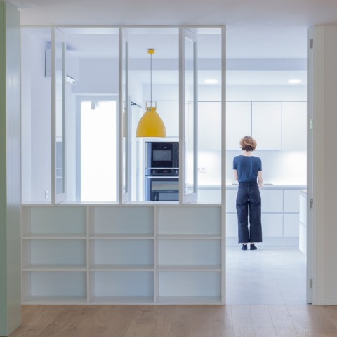 Después de estudiar todas las posibilidades, decidimos redefinir casi por completo el programa original de la vivienda con el objetivo de aprovechar al máximo todo el espacio y potenciar la entrada de luz natural desde las dos fachadas: derribamos la tabiquería, ampliamos el hueco de la fachada norte en el salón, prescindimos de una de las habitaciones y eliminamos uno de los baños para dejar solo dos, pero mucho más amplios. Con la nueva distribución, el salón-comedor y la cocina quedan ahora separados de la zona privada mediante un gran distribuidor-vestidor que también recibe luz de ambas fachadas a través de las puertas de los dormitorios, que llegan hasta el techo.