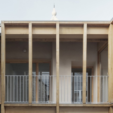 Así, se recuperó el patio original de la construcción, que había sido cubierto con una bóveda de metacrilato en la década de los 90, delimitándolo con la aparición de una nueva fachada formada por elementos estructurales de madera de castaño laminado, que funciona además como dispositivo de control y captación solar. Ya en el interior, se aprovechan los espacios generados por los muros de mampostería existentes para desarrollar el programa de necesidades de la manera más elemental posible, añadiendo exclusivamente un núcleo de circulaciones y otro de servicios.
