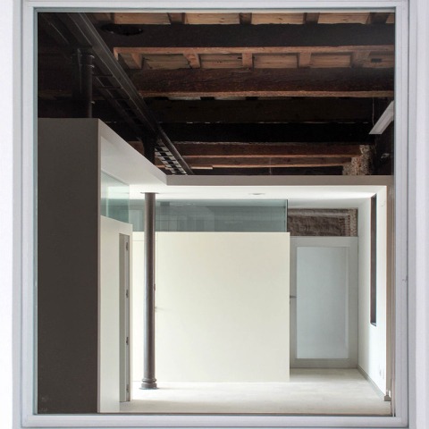 Intervenimos vaciando el edificio de toda compartimentación, desnudando los muros de yesos, eliminando los falsos techos que cubrían la original estructura de madera. Dispusimos de un nuevo suelo; piedra caliza de Campaspero, como el utilizado en la mayoría de las plazas de los pueblos del entorno. Poblamos el espacio interior de pequeñas construcciones, blancas, ligeras, estableciendo un dialogo de contrarios con el entorno de piedra y madera, tosco, pesado, patinado por el tiempo, que debía servir de cielo, suelo y horizonte. Proyectamos elementos de nueva creación que establecían una relación de complementariedad, más que de sustitución o recreación. Por eso las nuevas ventanas se insertan a modo de cajón, sin tocar los límites preexistentes; por eso las pequeñas construcciones tienen referencias formales abstractas frente a la condición vernácula del cajón que las encierra; por eso la puerta de entrada se retrae hacía el interior, yuxtaponiéndose, añadiéndose al intradós del grueso muro de mampuestos.
