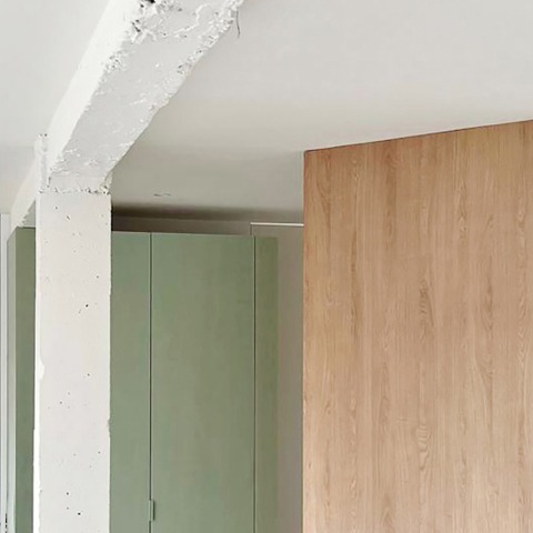 El fondo, de carácter neutro, se realiza con un suelo de microcemento elástico de tono gris claro, diluyendo la sensación de escala del espacio siendo blanco tanto paredes como techo. Contiene cocina-salón-comedor-salón, terraza, dos habitaciones; un tercer espacio flexible que puede cerrarse con una cortina y convertirse en habitación, despacho, sala de juegos o un lugar para hacer yoga.