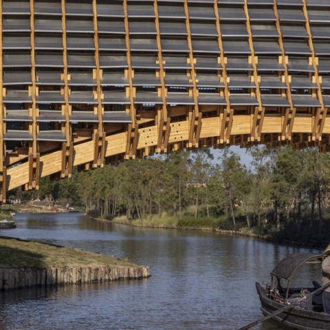 Este proyecto es un puente de madera, que es uno de los muchos en Gulou Waterfront Resort. Para diferenciarlo de las construcciones urbanas y revitalizar la cultura rural tradicional, el estudio LUO adoptó materiales de madera natural para construir un puente arqueado. El complejo brinda acceso a pequeños barcos de pesca, así como a grandes barcos turísticos. Para permitir que barcos de varios tamaños pasen sin problemas por debajo del puente, la plataforma de carga en la parte inferior del arco, que es 1,35 m más alta que el nivel normal del agua, combinada con la estructura arqueada de 2,8 m, forma un espacio de más de 4 m más alto que el nivel normal del agua. Esto cumple con los requisitos de autorización para el paso de grandes barcos turísticos. Según los estudios geológicos, la luz del puente se establece en 25,2 m. A través del cálculo estructural y el análisis de la construcción, el estudio LUO utilizó 3 grandes vigas curvas como componentes estructurales principales, que están dispuestas de manera paralela con una separación de 2,8 entre sí. Con plena consideración de los costos de fabricación y transporte, cada viga principal se dividió en tres secciones en las posiciones apropiadas, conectadas y ensambladas con pernos reforzados con acero en el sitio, para formar la viga de madera completa.