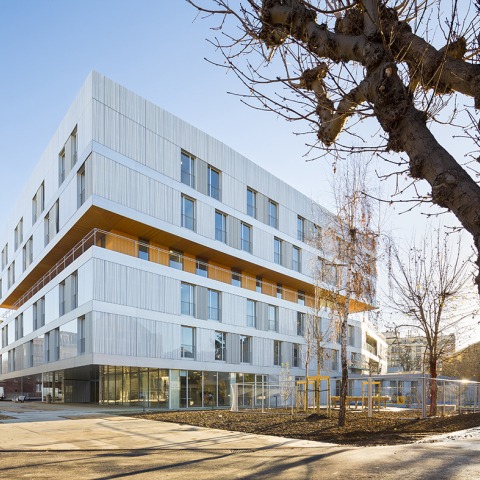 Mientras que las zonas comunes en este tipo de edificios se encuentran a menudo en la planta baja, AZC los ha puesto en el centro del edificio, en el tercer piso. De hecho, el tercer piso es una ruptura horizontal en la forma del proyecto. Por encima, los pisos cuatro y cinco tienen una huella más pequeña que las tres plantas inferiores, permitiendo la creación de amplias terrazas. También crea una ruptura en las funciones del edificio, con el suelo reservado para actividades de grupo, que se llevan a cabo en espacios grandes, acristaladas que dan a los jardines internos. Terrazas cubiertas, como grandes logias intermedias, también se encuentran en las dos primeras plantas. La planta baja se libera para obtener la máxima transparencia hacia el jardín de la guardería. Esto permite que la luz llegue a las terrazas y patios, la apertura de amplias vistas a la ciudad y a las zonas ajardinadas.