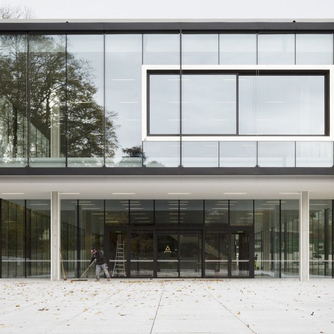 Aunque el pabellón está completamente acristalado, la extensión, de la cual más del 70% se ha organizado bajo tierra, solo tiene una pérdida de calor limitada. Persianas reflectantes móviles y un techo verde intenso contribuyen al acondicionamiento del aire de esta extensión.