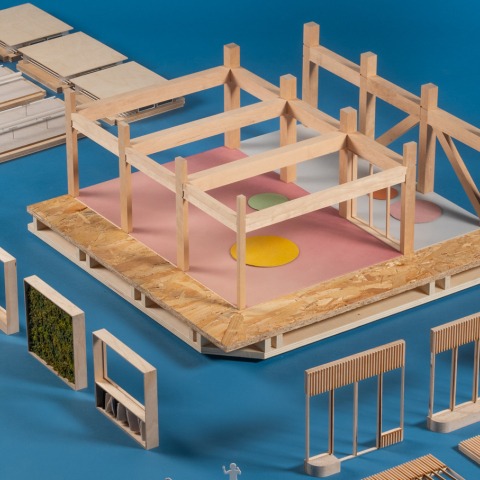 El sistema consta de pilares de madera estandarizadas y paneles de suelo de madera contralaminada, que están conectados por juntas de acero reciclado. Todos los componentes se fabrican con precisión en fábrica bajo un proceso controlado digitalmente para garantizar un montaje y desmontaje rápido con la ayuda de una grúa eléctrica. Estos componentes se disponen en retículas estructurales, dejando todos los tabiques libres de carga para crear espacios de diferentes tamaños y usos, incluyendo aulas, auditorios y jardines. Los tabiques son de base biológica y se pueden adaptar para soportar actividades como la escalada en interiores y la agricultura vertical.
