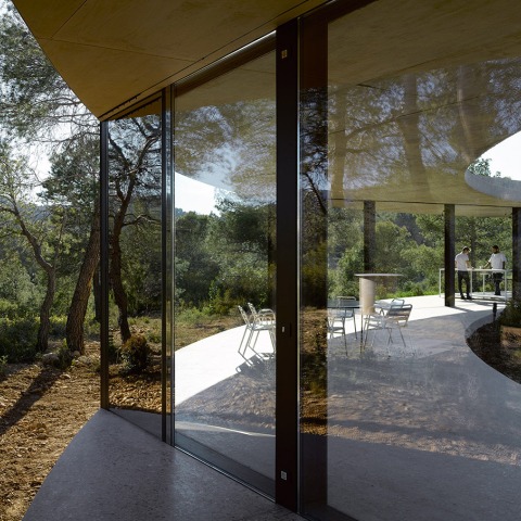 El techo circular simple con un diámetro de 40 metros subraya las cualidades tanto de la meseta como de su borde. El techo funciona como un refugio y forma el perímetro de la superficie habitada. Grandes tramos de fachada de cortina se deslizan en el borde exterior del círculo, permitiendo que las áreas de vida se abran completamente, y proporcionando una relación máxima entre el habitante y la naturaleza circundante.