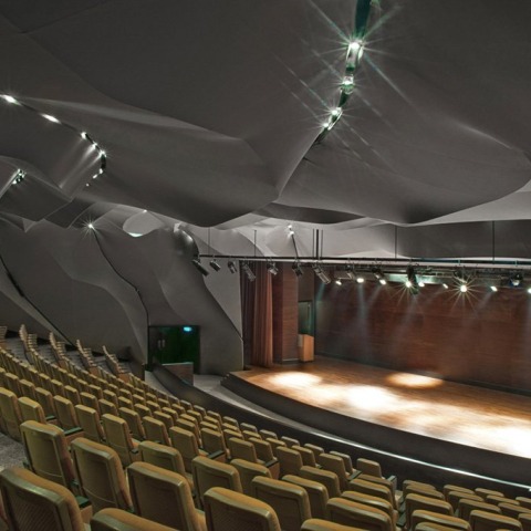 La propuesta de diseño es envolver las paredes y el techo de la sala del auditorio con una superficie ondulada similar a las dunas de arena del desierto. La luz atraviesa suavemente las grietas de la superficie reforzando esta idea formal. Estas grietas está compuestas de tela elástica y forman una superficie limpia ocultando las instalaciones y el aislamiento acústico. Los asientos se mantienen, pero han sido recubiertos con un nuevo tejido del mismo color tierra que las paredes y el techo.