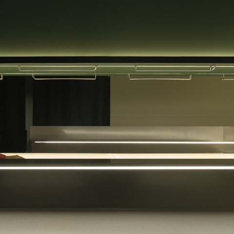 El espacio está dominado por un tono verde grisáceo, que es una mezcla de tono "verde" natural y color "gris" futurista. Superficies de diferentes tonalidades, materiales maleables, expresiones cinematográficas y composiciones geométricas dan como resultado un espacio táctil.