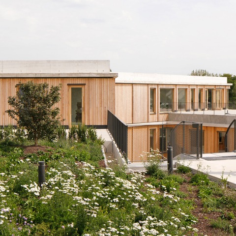 Con un sistema de losa activa y una alimentación mediante una red de geotermia, el edificio se concibe como confortable y sostenible. Ofrece una solución basada en materiales respetuosos, como la madera —empleada en las fachadas y en las estructuras prefabricadas—, que aporta durabilidad y un impacto positivo en el entorno, reforzado por la presencia vegetal en la terraza verde de la azotea, la cual cumple la función de refugio para la flora y la fauna locales.