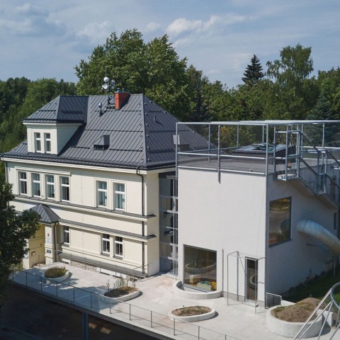 La ampliación del jardín de infancia Montessori en Jablonec nad Nisou es un edificio de dos plantas de hormigón armado. Se encuentra al lado de un edificio histórico de jardín de infancia y su forma y material contrastan con este edificio más grande. Es un prisma simple con algunas protuberancias, que está completamente envuelto en una malla de acero inoxidable. En el interior, el edificio se divide verticalmente en planta baja y tres plantas intermedias dispuestas en torno a una escalera y un vacío, sobre el que se encuentra un gran lucernario en la cubierta. En los pisos intermedios hay espacios para que los niños pasen el tiempo, cada piso intermedio tiene una atmósfera y forma diferente para estimular la mente de los niños de una manera diferente. La ampliación está conectada con el edificio histórico del jardín de infancia en la planta baja y en el segundo piso. Desde la planta baja hay acceso directo a la terraza de juegos cubierta de hormigón sobre el aparcamiento. Desde el segundo piso, un tobogán al aire libre conduce de regreso a la planta baja, que los niños pueden usar para acelerar su descenso. Desde el tercer nivel intermedio hay un portal con escalera exterior que conduce a la azotea. Este está equipado con una red de seguridad y puede convertirse en un gran parque infantil de verano. La ampliación aumenta la capacidad del jardín de infancia en una clase.