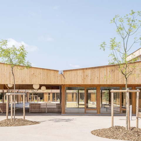 El proyecto, de baja altura, se levanta tres veces señalando las tres entidades principales: la guardería, la sala multiactividades y el centro de ocio. La entrada de la escuela es una oportunidad para crear una pequeña plaza pública en esquina, duplicada por un patio delantero protegido y seguro, que supone un espacio de transición entre el exterior y el interior.