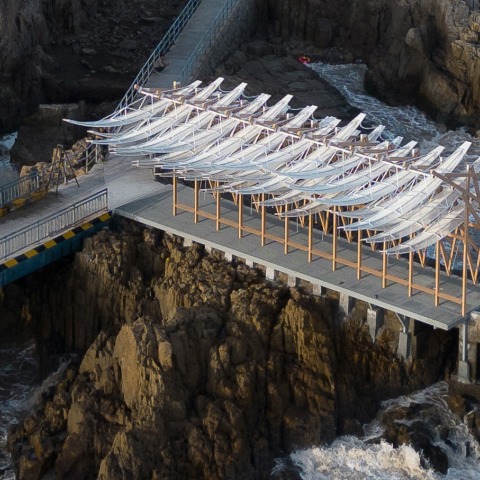 El concepto original se basaba en los movimientos de las mareas para el movimiento. Cuando los visitantes se sentaban en el pabellón, las olas y la estructura subían y bajaban juntas durante horas. Sin embargo, para tener en cuenta al público principal (los turistas), se ha revisado el diseño para utilizar la energía eólica para lograr efectos instantáneos. La forma también se ha optimizado para que los cambios sean más notorios. Tras varias inspecciones del lugar, el lugar elegido es un antiguo muelle de carga de los años 60, situado entre la nueva terminal de pasajeros y el pueblo. Rodeado de rocas escarpadas y con un cielo azul y el mar como telón de fondo, el lugar ofrece un entorno perfecto.