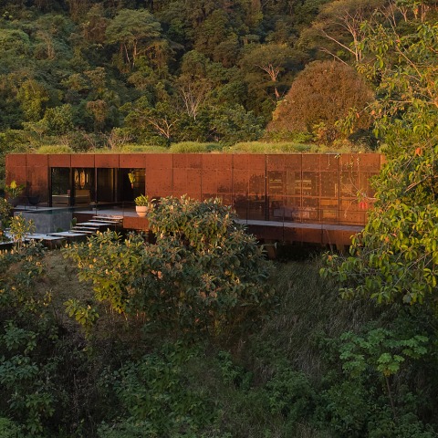 Ubicado contra una pendiente empinada, el objeto prismático de 26 metros de largo levita parcialmente sobre la exuberante vegetación tropical. Mirando hacia afuera, solo hay un océano distante o colinas verdes hasta donde alcanza la vista; La pared posterior que da al camino de entrada y las villas vecinas no tiene ventanas intencionalmente, para mantener la privacidad.