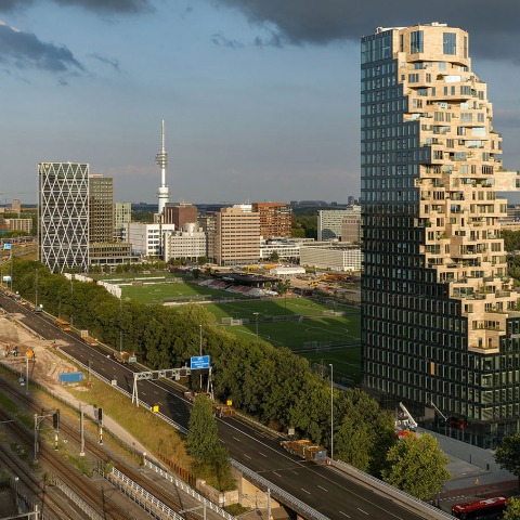 El espectacular Valle, de inspiración geológica y cubierto de plantas, destaca en el barrio de Zuidas de Ámsterdam con sus tres torres de 67, 81 y 100 metros y sus espectaculares apartamentos en voladizo. apartamentos en voladizo. Nombrado mejor rascacielos nuevo del mundo en los premios Emporis Skyscraper Awards de 2021, el edificio se distingue por varios aspectos: en primer lugar, combina oficinas, tiendas, restauración, instalaciones culturales y apartamentos en un solo edificio; en segundo lugar, a diferencia de los edificios cerrados de otros lugares de Zuidas, el valle verde que serpentea entre las torres de las plantas cuarta y quinta es accesible a todo el mundo a través de dos escaleras exteriores de piedra.