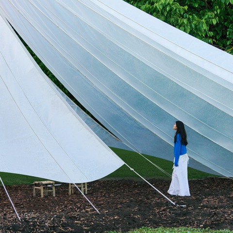 Ponerse bajo la sombrilla es como entrar en un íntimo teatro al aire libre, donde los visitantes se sumergen en la luz cambiante y los sutiles cambios atmosféricos. Experimentan patrones cambiantes de luz y sombra, junto con una sutil diferencia de temperatura entre el interior y el exterior.