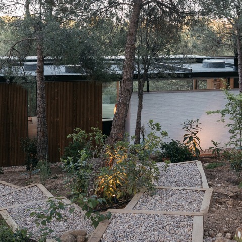 El jardín es en esencia el pinar existente completado con varios arces y liquidambar que le dan el cambio de color con las estaciones y ese verde fresco que tiene la hoja caduca. Hemos plantado además higueras, limoneros y naranjos y construido una alberca en la parte baja del jardín, donde se recoge el agua de lluvia y crecen azucenas acuáticas y calas. Gracias a un fino caño de cobre, podemos escuchar el murmullo del agua desde la terraza.