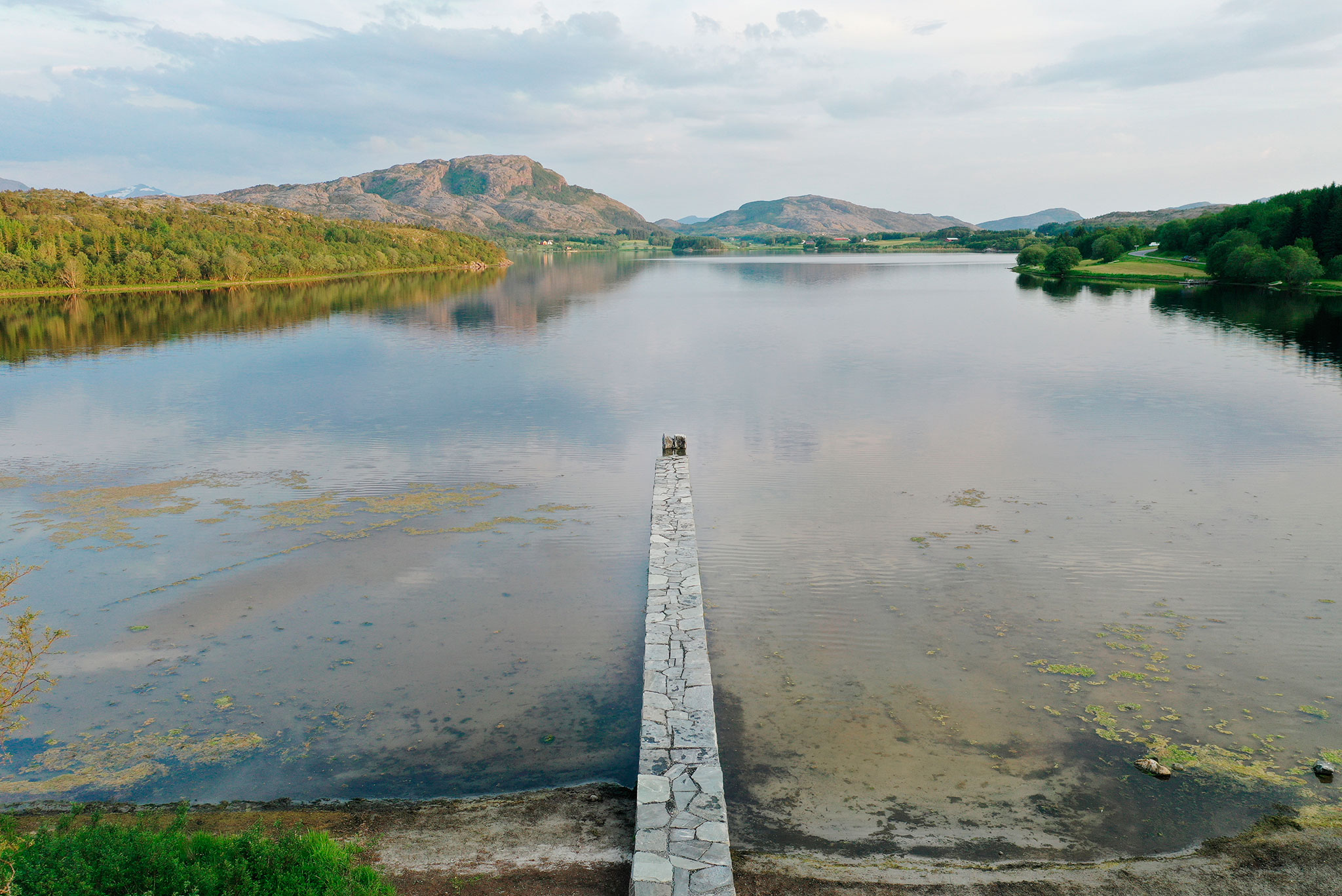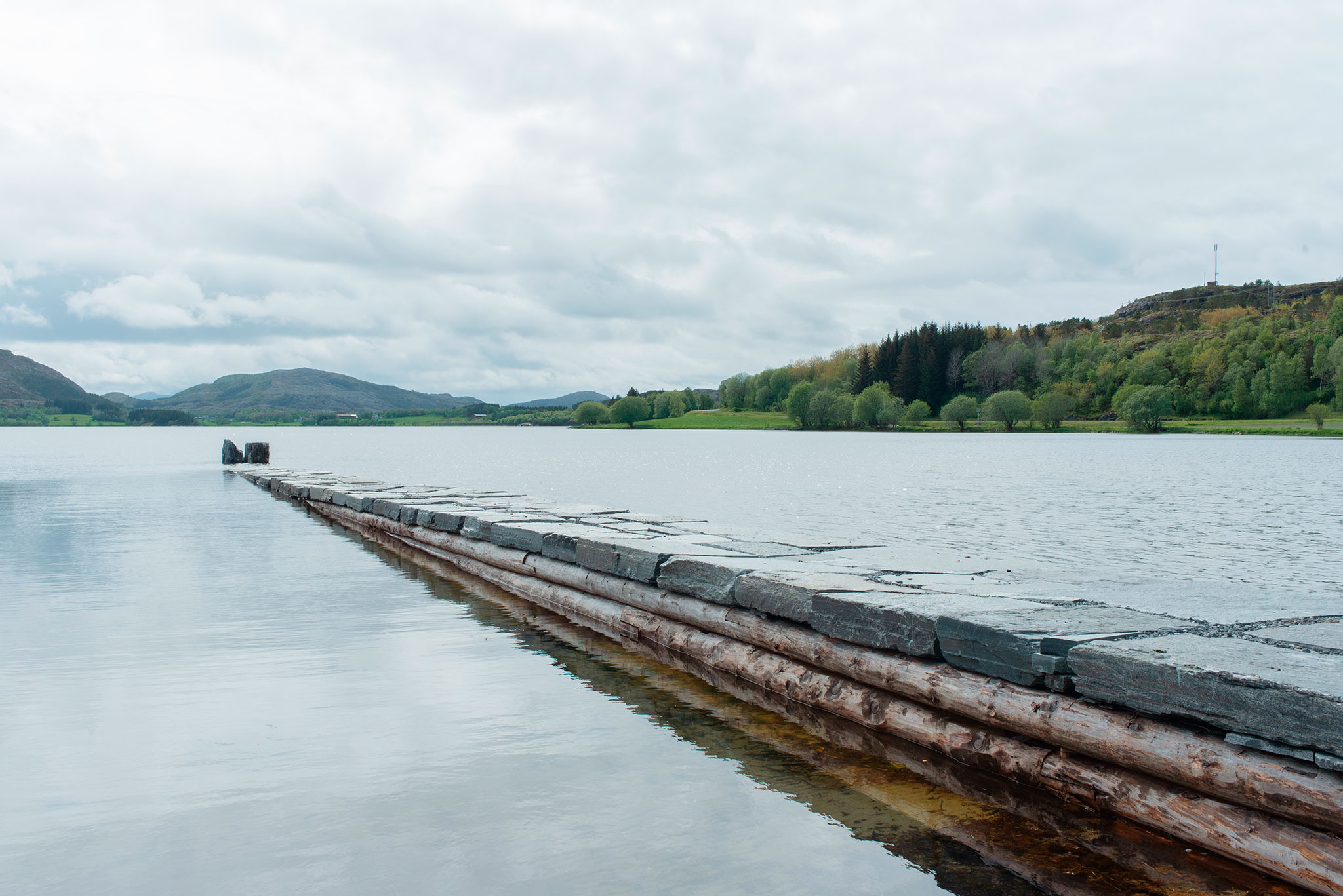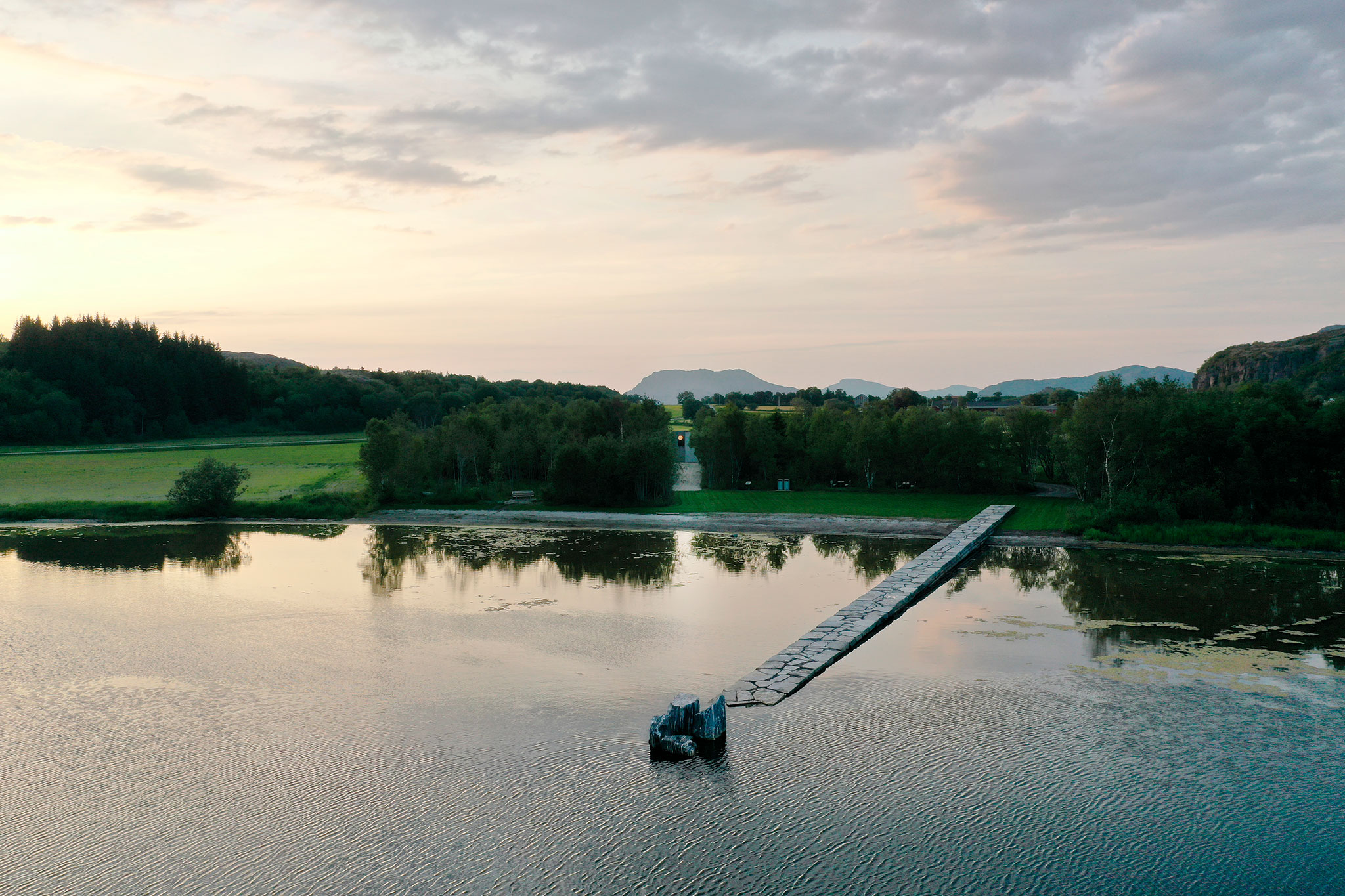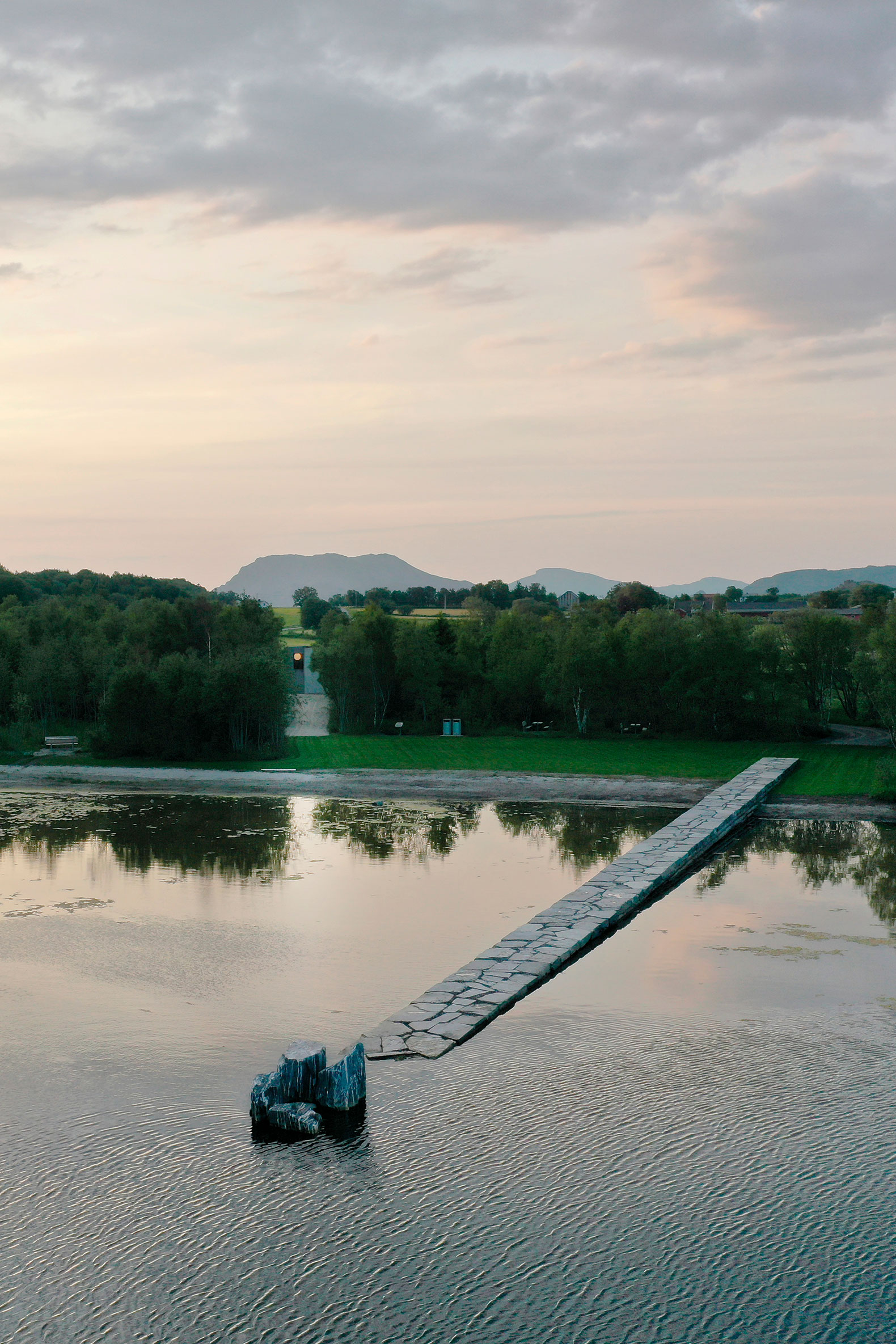En el corazón de la zona se encuentra un nuevo, pero tradicional, embarcadero de piedra y madera que se extiende desde tierra firme, a través de las aguas poco profundas, hasta las aguas más profundas. Estos embarcaderos de suave pendiente han sido característicos de la costa noruega desde hace mucho tiempo, construidos para permitir el acceso de embarcaciones en todos los niveles de marea. Más allá de su uso práctico, también proporcionan una protección contra el viento y las olas que los muelles flotantes no pueden ofrecer. Aquí, el embarcadero ancla el sitio tanto visual como funcionalmente, enmarcando la playa, marcando los cambios en el nivel del agua del lago a lo largo de las estaciones y recordando el patrimonio marítimo de la región.