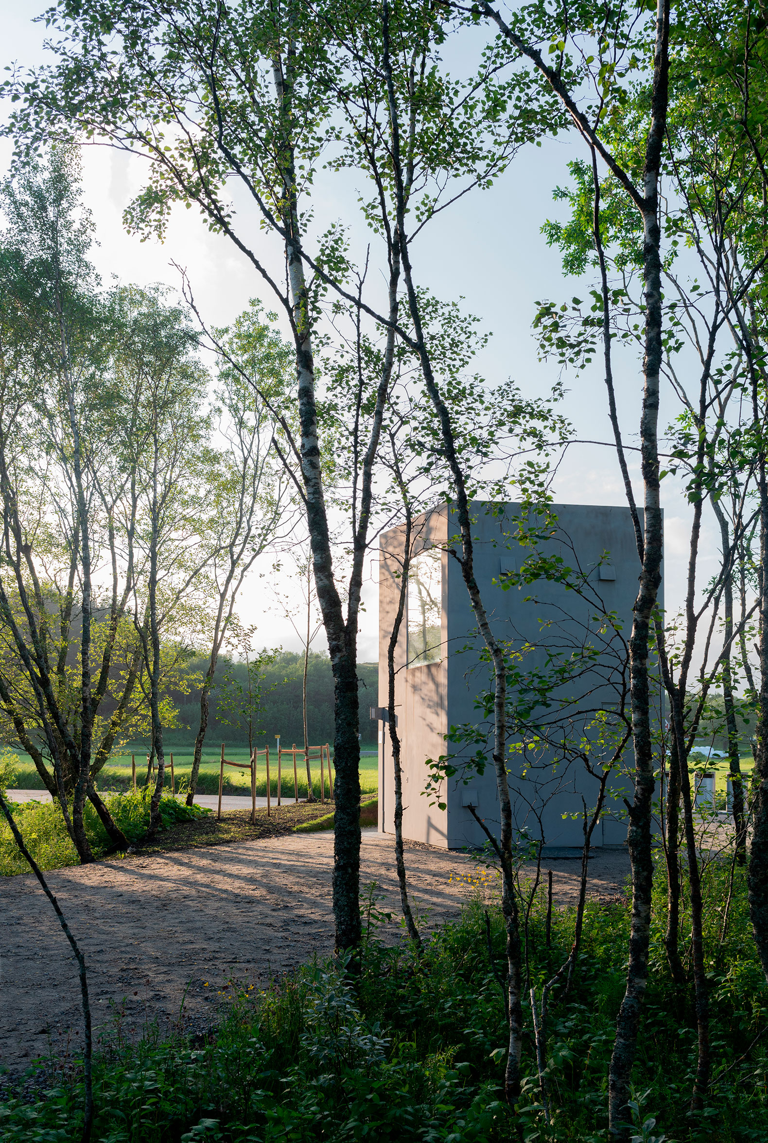 El diseño sigue las líneas del paisaje, permitiendo que la geometría del sendero, el embarcadero y el terreno agrícola circundante converjan en una sutil alineación. El sendero y el embarcadero se sitúan en el mismo eje, de modo que la punta del muelle es visible desde el momento en que uno se adentra en el bosque y reaparece como un punto fijo en la perspectiva que se despliega. Por la noche, la tenue luz del edificio de aseos se percibe desde el embarcadero, conectando visualmente los dos extremos del terreno a lo lejos. La orientación de estos elementos evoca las líneas del camino de acceso y los campos de cultivo, reforzando la sensación de que la intervención forma parte del orden existente, en lugar de imponerse a él.