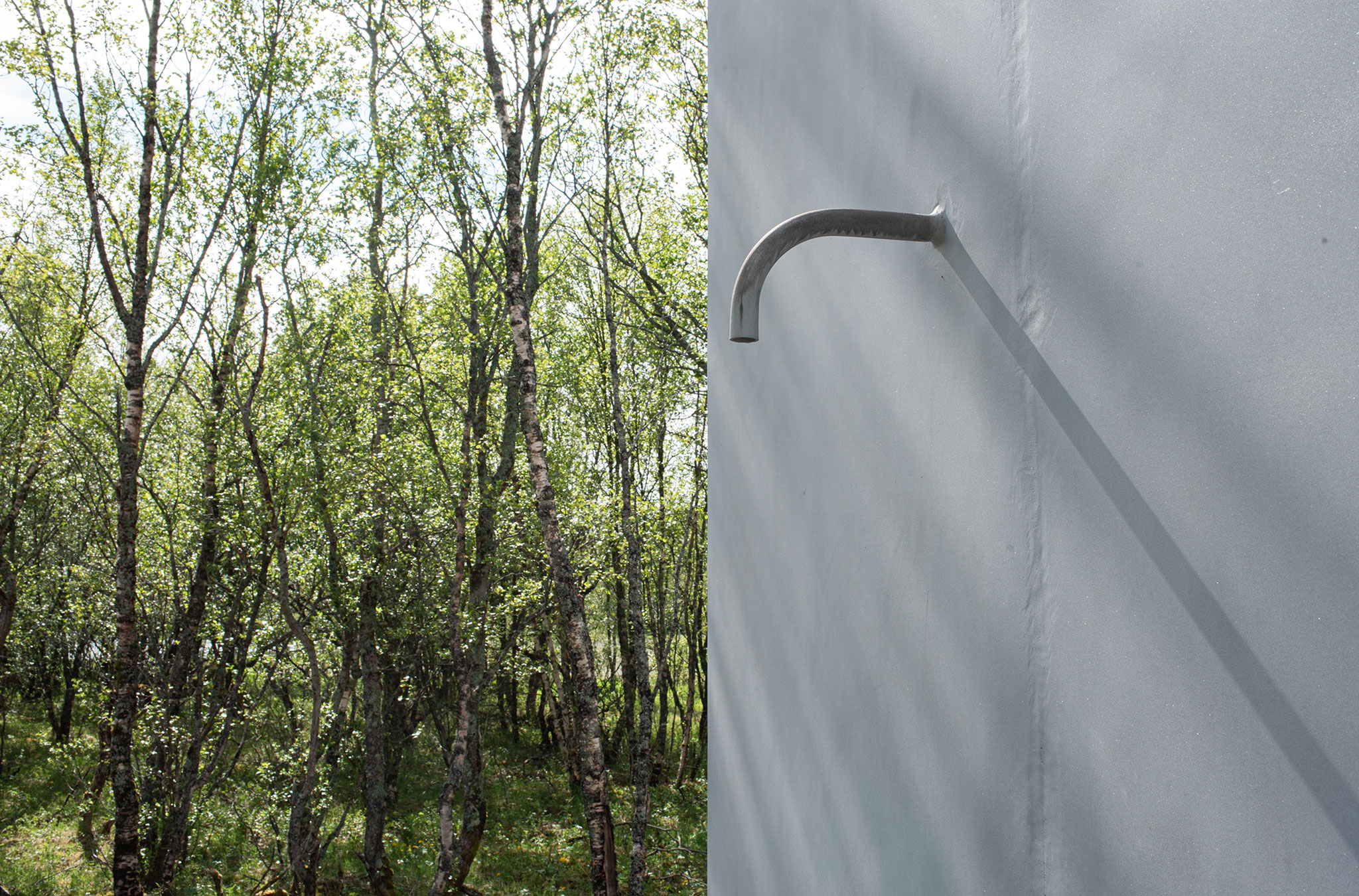 Los materiales utilizados en el proyecto reflejan tanto la continuidad como el contraste. El embarcadero se construyó según los principios de construcción tradicionales, utilizando una estructura de cunas de madera rellenas de piedras de la obra. Grandes losas de pizarra natural forman una superficie para caminar robusta y cómoda. La madera se selecciona cuidadosamente según su posición respecto al agua: se utilizan troncos de álamo temblón con la corteza intacta para las partes que permanecen constantemente sumergidas, ya que esta especie se comporta mejor en estas condiciones, mientras que las secciones expuestas alternativamente al aire y al agua están hechas de pino denso y descortezado, elegido por su resistencia a los niveles de humedad fluctuantes. El edificio del baño, en cambio, está fabricado en aluminio granallado por un taller local. Ambos elementos emplean materiales duraderos, pero expresan temporalidades distintas: uno arraigado en la artesanía tradicional, el otro en la fabricación contemporánea.