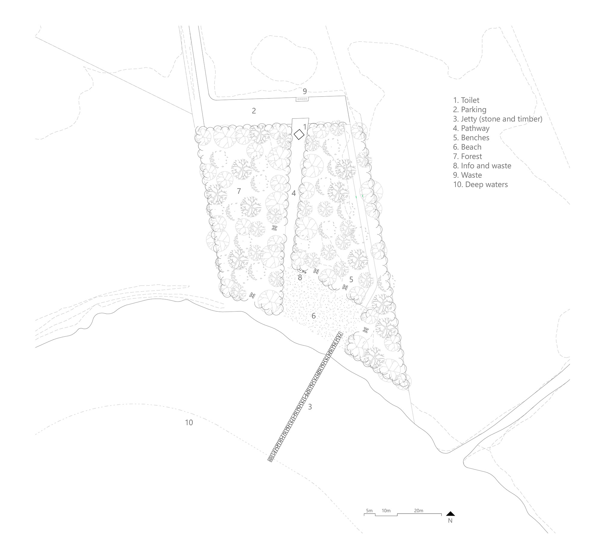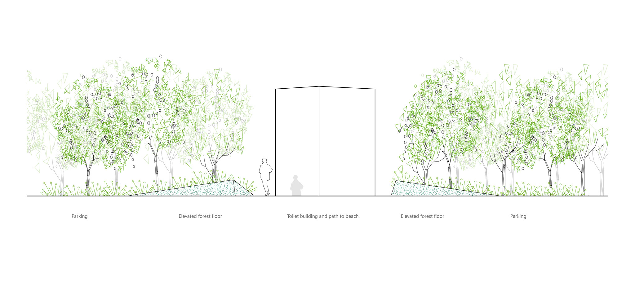 Por medio de una serie de sutiles operaciones, la propuesta acentúa las bondades naturales del paisaje natural de Sundshopen. Un paseo en medio de la vegetación, que bordea la densa extensión de tierras de cultivo, converge con el embarcadero, realzando la transición del bosque cerrado hacia el mar abierto.